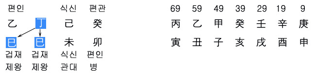 해설-2) 본장 십이운성 제왕(帝旺)지에 적용하면 일간 丁火를 기준하여 일지/시지 巳火가 제왕지에 앉아 있으니 사주주인공은 자기중심적인 면이 강하며 고집과 자존심이 타의추종을 불허하니 그로인한 타인과의 불화가 염려된다 하겠다.