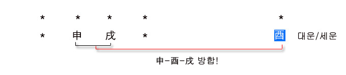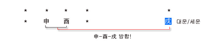 申 酉 戌 午 戌合을 먼저 따라가고 申-酉-戌 방합은 성립하지 않는다.