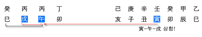 결론적으로 위 사주는 午-戌合火 준삼합과 巳-午合火 준방합이 투합하여 합을 방해하고 있으나 준삼합과 준방합의 기운이 서로 일치하므로 이때는 午-戌合/巳-午合을 함께 취용한다.