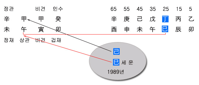 ▶ 대운천간 丁火는 일간에 대한 상관이며 길신으로 사주원국의 시상 정관/辛金을 丁-辛상충하고 년간 인수/癸水를 丁-癸상충으로 가격하니 길함이 반감되고 있다.