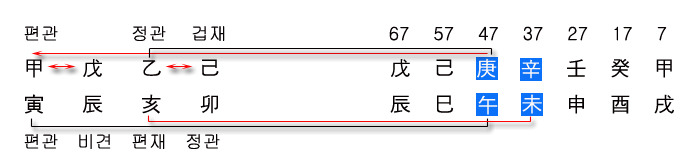 ▶ 지지 申-酉-戌 합금 방합하고 午-戌 합화 준삼합이 쟁합하는 중에 사왕지지(子-午-卯-酉)인 酉金이 월지에 있지 않아 준삼합 午-戌 합을 먼저 취용한다.
