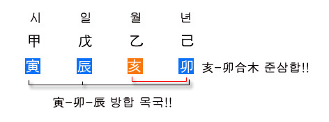 ▶ 지지 寅-卯-辰 합목 방합하고 亥-卯 합목 준삼합을 쟁합하는 중에 합의 기운을 대표하는 월상/乙木과 시상/甲木이 투출하여 합의 기운을 동조하니 완벽한 지지 木局을 이룬다.