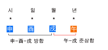 그러나 방합과 준삼합의 기운이 일치하면 합의 기운이 한곳으로 모이게 되므로 이때는 방합과 준삼합을 함께 성립하며 더하면 합의 기운을 대표하는 오행이 천간에 투출되면 완벽한 지지 합국을 이루게 된다.
