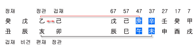 대운천간 辛金은 일간에 대한 상관이며 기신으로 사주원국의 월상 정관/乙木을 乙-辛상충으로 가격하니 이는 사주 내 乙-己상충을 중첩하여 파극하는 것이라 사업/금전으로 인한 기복과 변동성을 예시하고 있다.