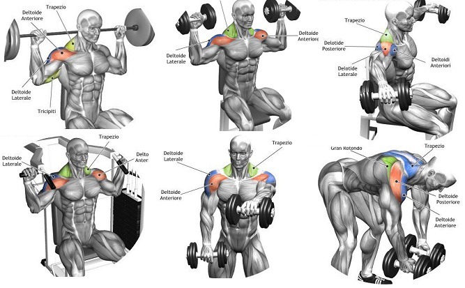 앞쪽의 전면삼각근(anterior deltoid, 전삼각근이라고도 한다)은 쇄골에 부착되어 있고 팔을 몸의 앞쪽으로 올린다(어깨 굴곡).