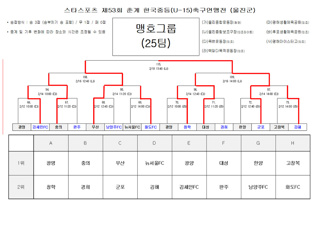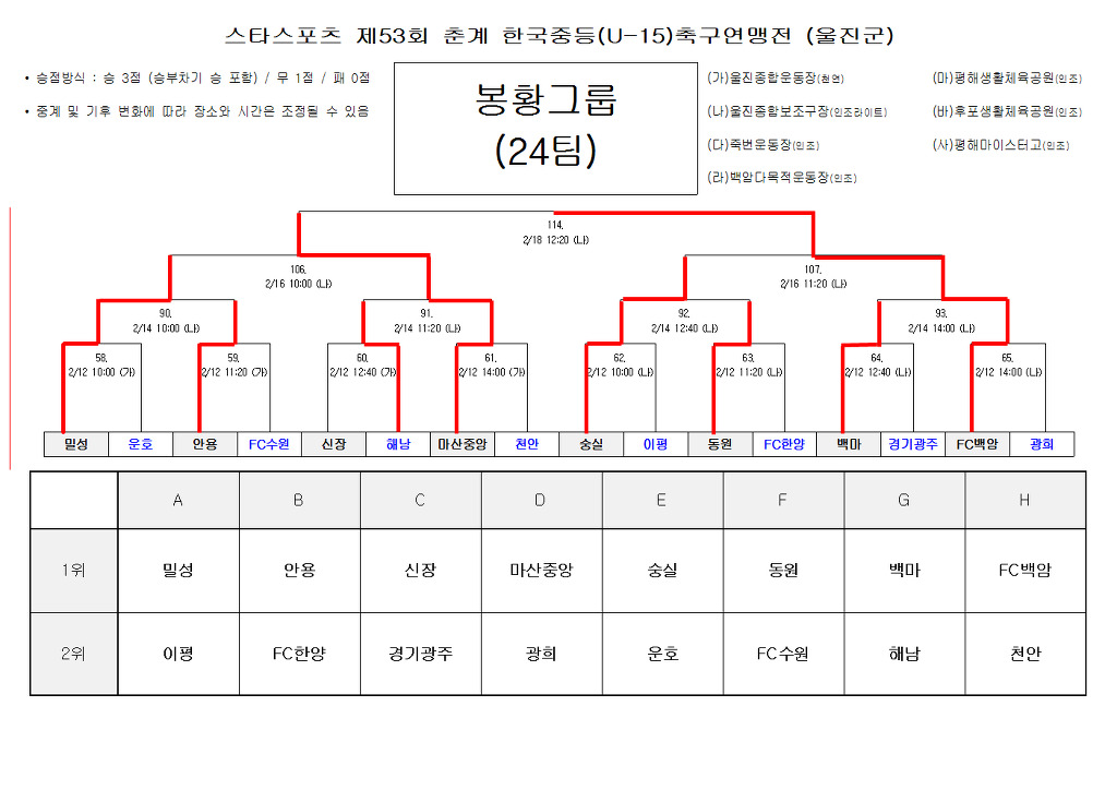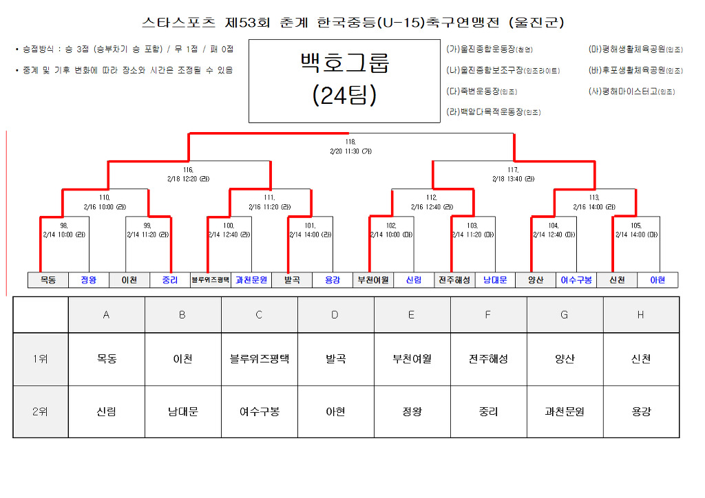 [2017년도 춘계연맹전] 스타스포츠 제53회 춘계 한국중등(U-15)축구연맹전 -울진군- 백호, 봉황, 맹호그룹 결과 작성자중등축구연맹|작성시간17.02.10|조회수17,853 목록 댓글 0 글자크기 작게가 글자크기 크게가 다음검색 현재 게시글 추가 기능 열기 북마크 공유하기 신고 센터로 신고 댓글 댓글 0 댓글쓰기 답글쓰기 댓글 리스트