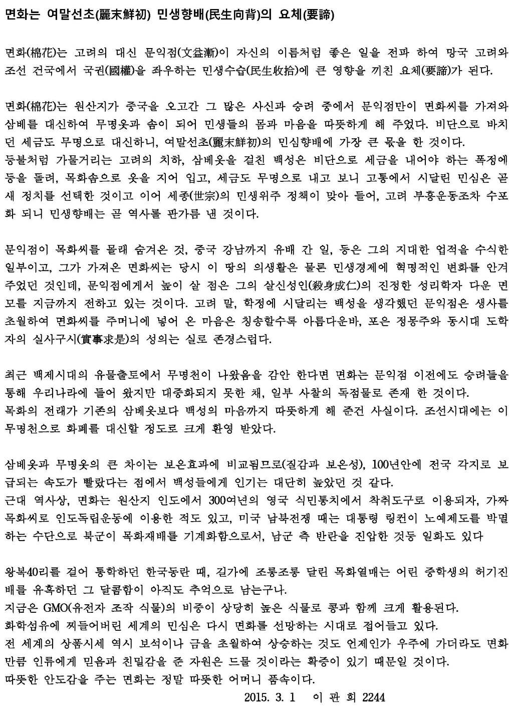작성자2244 작성자 본인 여부 작성자 작성시간 15.03.24 문익점(文益漸) 문물을 유익하도록 옮긴다=의 이름을 갖인 분이다. 려말 조선초에도 각기 자신의영달을 위한 싸움에서 뒤쳐지지 않으려고 치열한 경쟁을 하던 시기에 오로지 고생하는 백성을 생각하여 위험한 모험을 하면서 면화씨(文物)를 옮겨와서(漸播) 많은 사람들에게 이익(利益)을 주었다. 이 면화는 문익점선생이 갖어오기 이전 백제시대에 이미 불교의 절에서 먼저 재배하여 옷을 만들어 입었던 흔적이 최근 백제시대 사찰고분에서 발견된 점으로 보아 당시 불교 역시 정치모리배들과 다를 바 없이 자비심보다는 자기들만의 이익에만 급급했던 모습을 풍겨주는 사회상의 일면을 노출하였다 할 것이다. 종교역시 탐락하면 이런모습이다