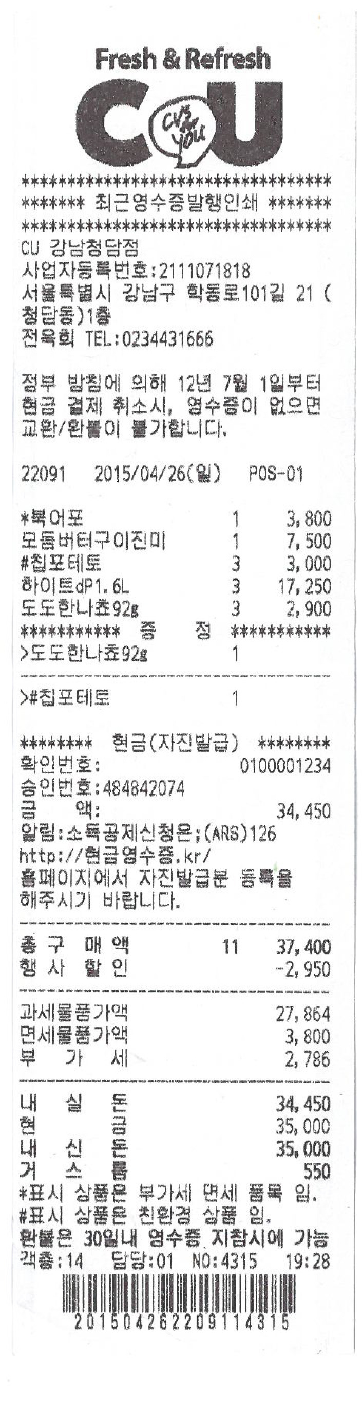 뒷풀이2차(편의점 맥주)비용 34,450원(회비에서 지출하였습니다.)