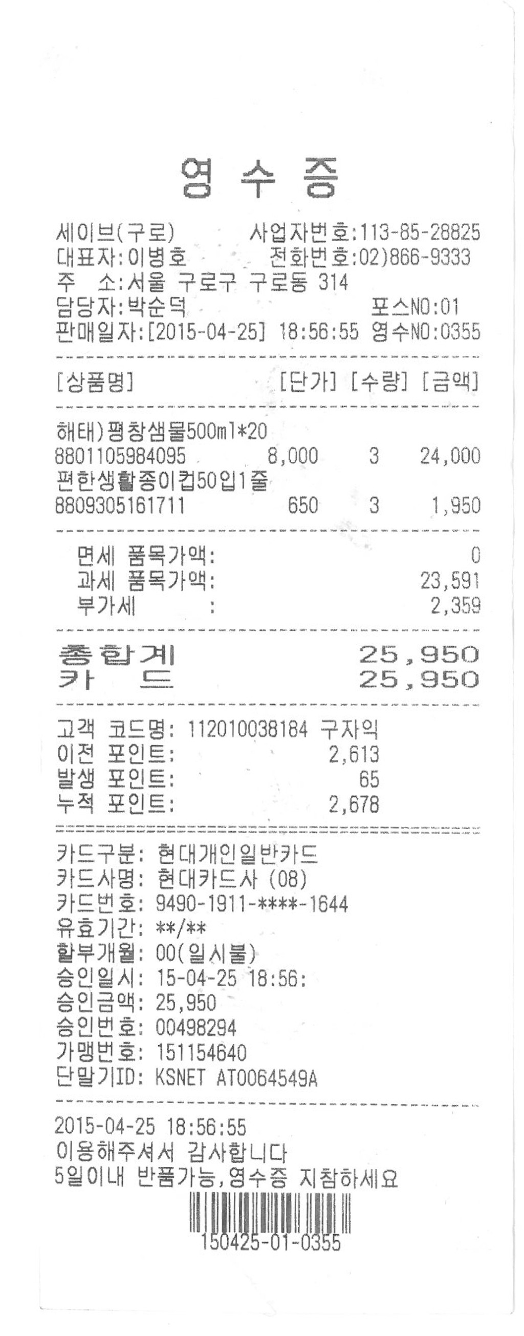 식수 및 컵등의 구입비용 27,550원