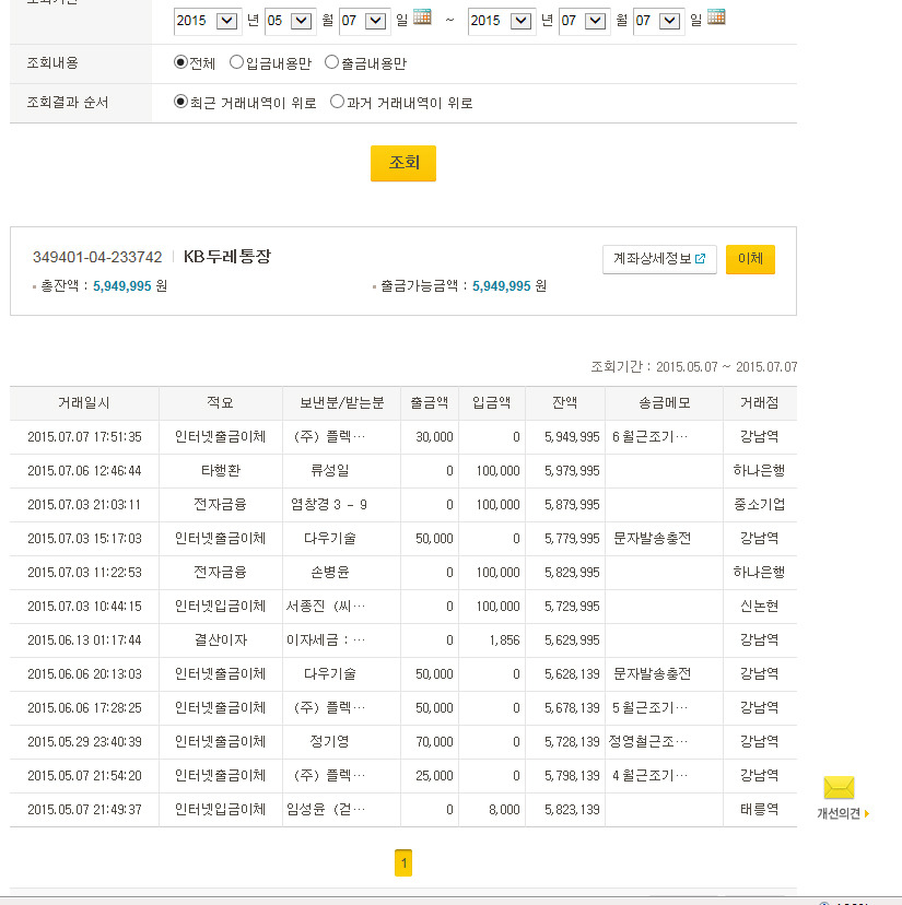 그리고 7월들어 동기회비협조문자 및 밴드공지를 통해 7월 1일부터 7월 10일 현재까지의 동기회비 신규입금자는 서종진(3-8), 손병윤(3-3), 염창경(3-9), 류성일(3-4)이며, 6월 근조기비용(30,000원)과 문자발송충전(50,000원)을 지출하여 현재 잔액은 5,949,995원입니다.