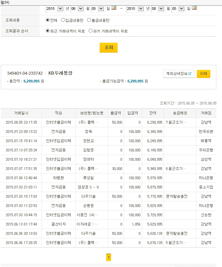 7월 동기회비 입출금내역 및 신규회비납부명단
