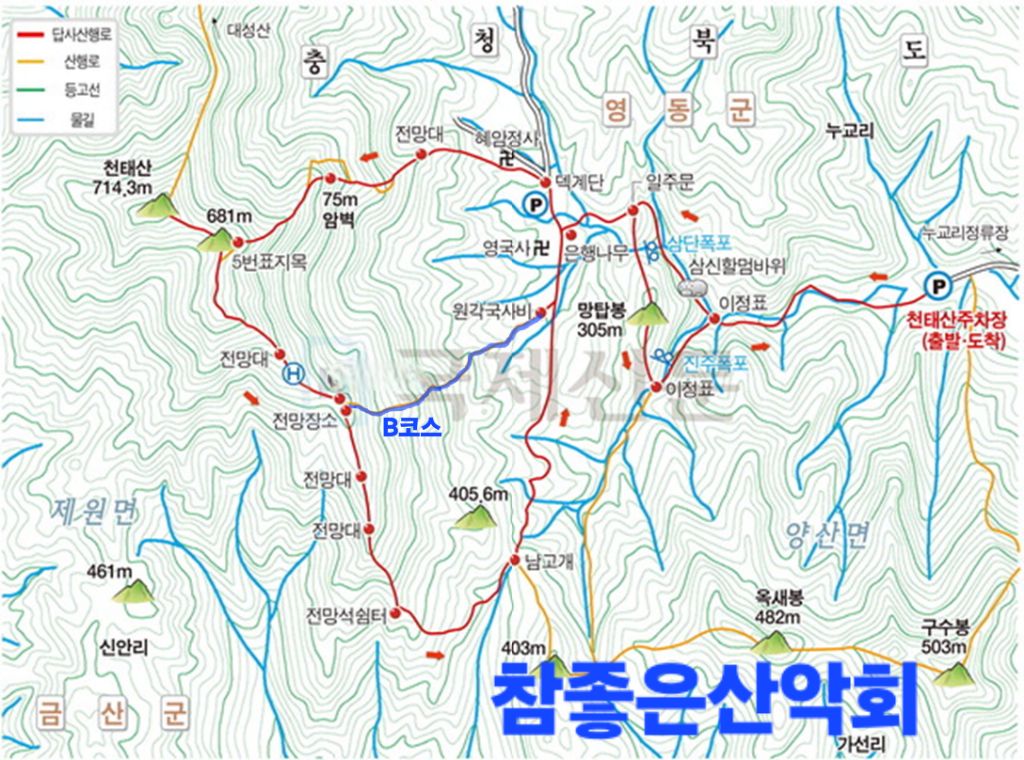 주차장-삼단폭포-영국사-75m대슬랩(우회로이동가능)-천태산(714.3m)-헬기장-B코스갈림길-원각국사비-영국사-망탑봉(상어흔들바위)-진주폭포-주차장