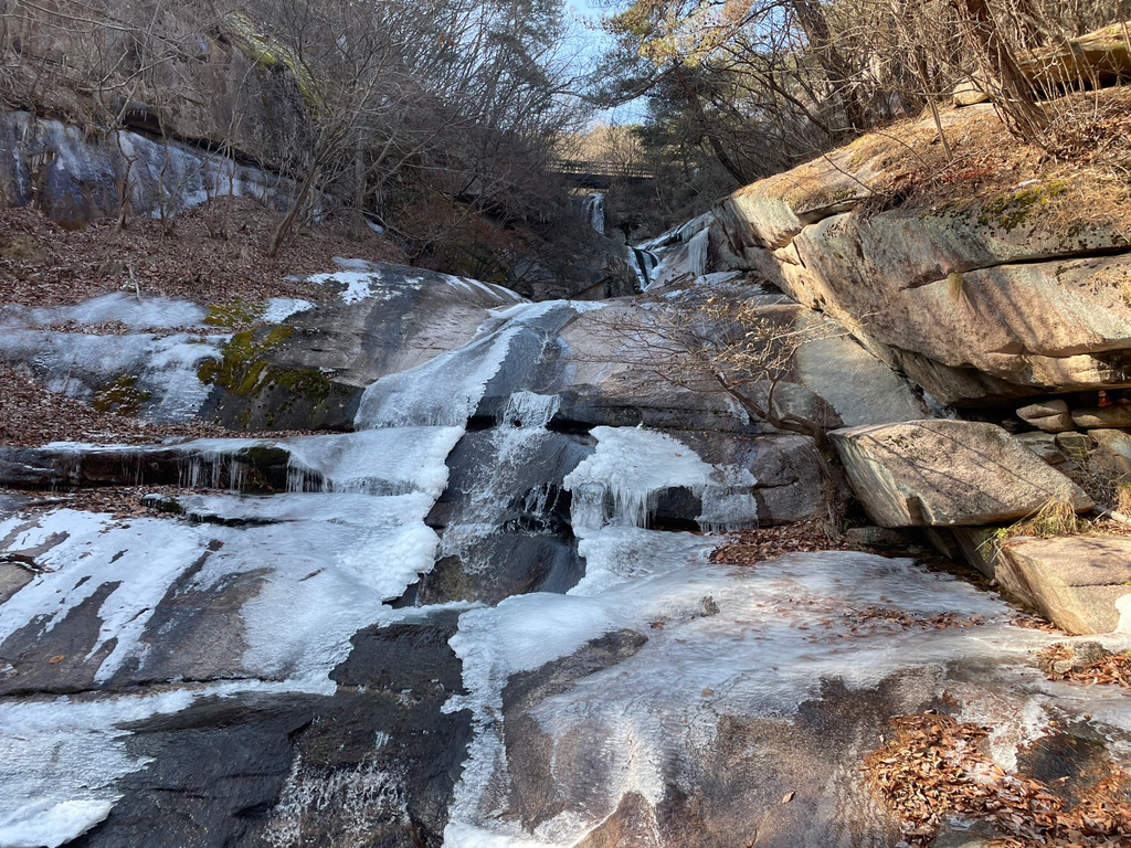 주차장-삼단폭포-영국사-75m대슬랩(우회로이동가능)-천태산(714.3m)-헬기장-남고개-영국사-망탑봉(상어흔들바위)-진주폭포-주차장 (약7km,4시간)