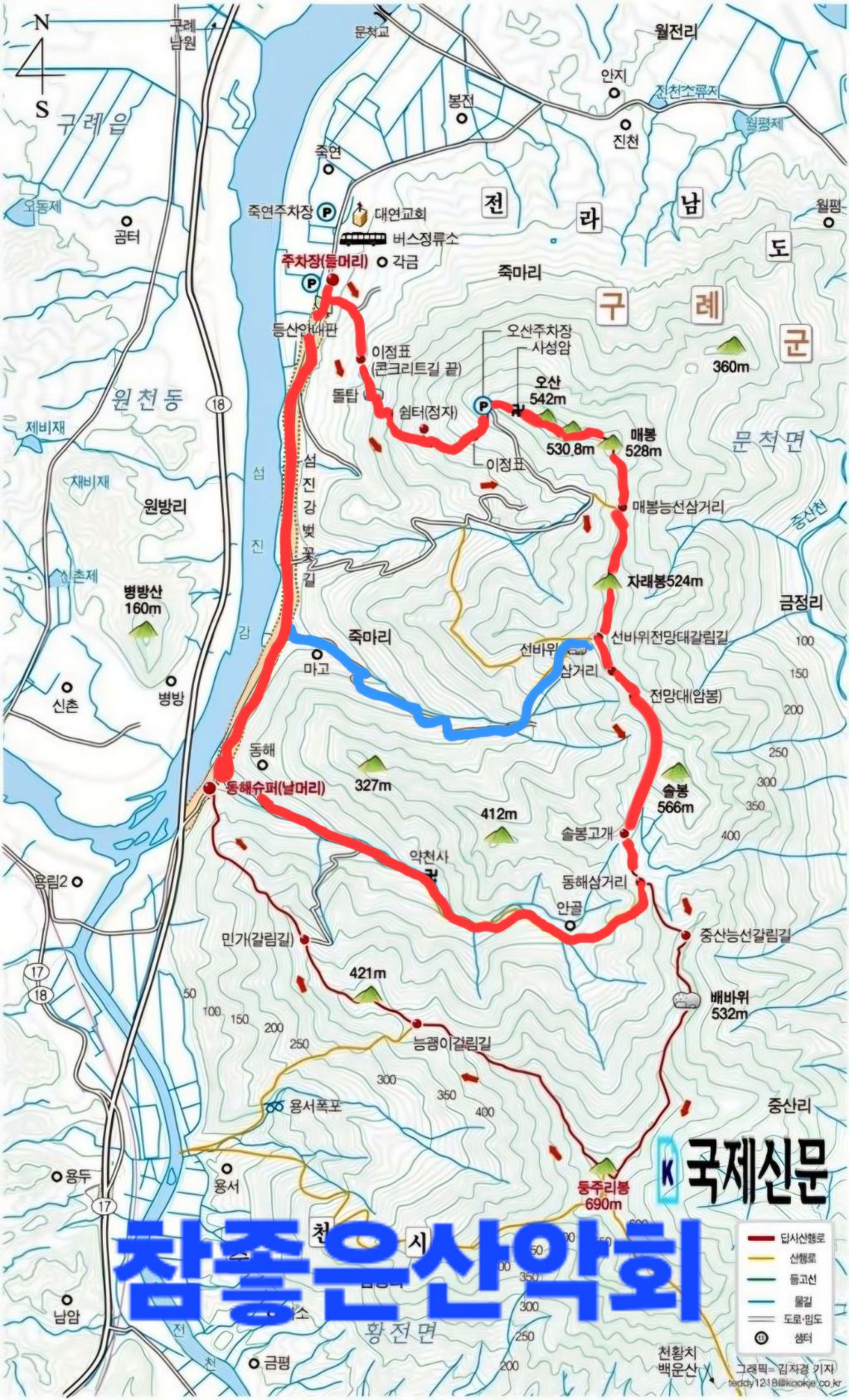 죽연마을주차장 ->사성암 ->오산정상 ->매봉 ->자례봉 ->선바위 갈람길 ->솔봉고개 ->안골 ->약천사 -> 동해마을 ->섬진강벚꽃길->죽연마을주차장(약9km,4시간 30분)