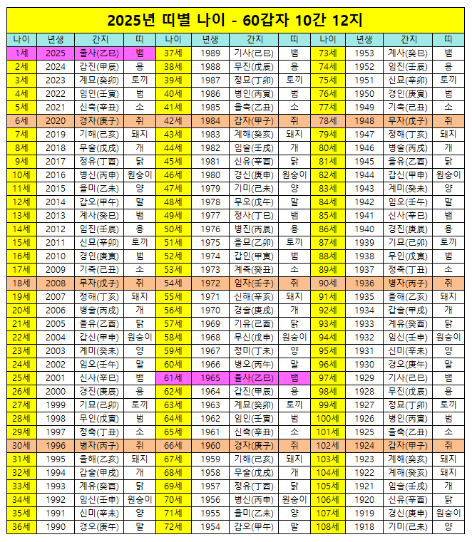 60갑자 띠별 나이 2025년 뱀띠(乙巳年 을사년)10간 12지 작성자박영민|작성시간25.01.02|조회수49 목록 댓글 0 글자크기 작게가 글자크기 크게가 60갑자 띠별 나이 2025년 뱀띠(乙巳年 을사년)10간 12지 다음검색 현재 게시글 추가 기능 열기 북마크 공유하기 신고 센터로 신고 댓글 댓글 0 댓글쓰기 답글쓰기 댓글 리스트