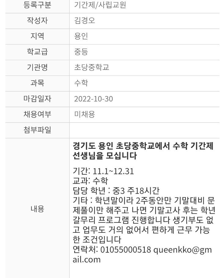 용인초당중에서 수학기간제 선생님을 모십니다 작성자꼬미3|작성시간22.10.29|조회수61 목록 댓글 0 글자크기 작게가 글자크기 크게가 다음검색 현재 게시글 추가 기능 열기 북마크 공유하기 신고 센터로 신고 댓글 댓글 0 댓글쓰기 답글쓰기 댓글 리스트