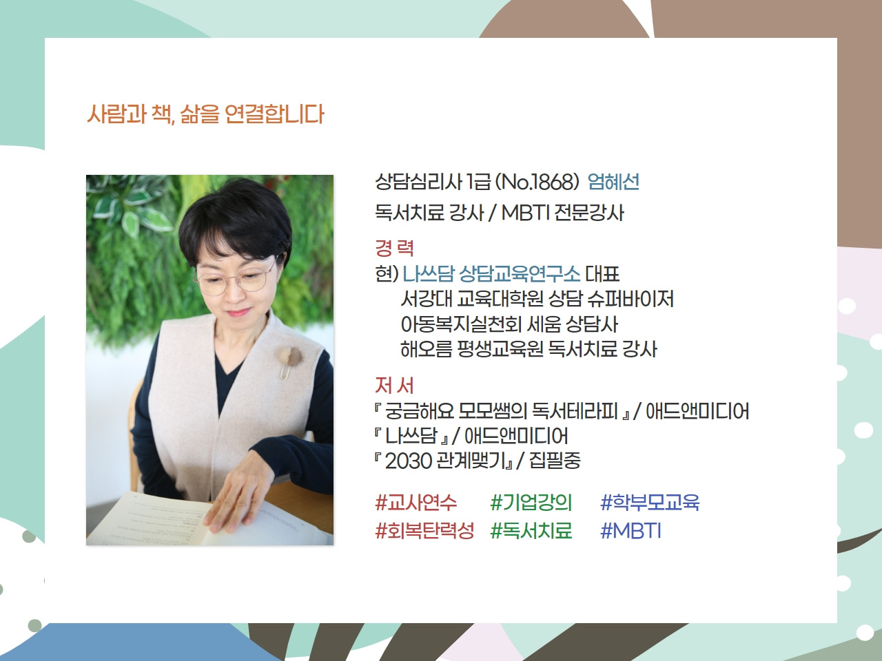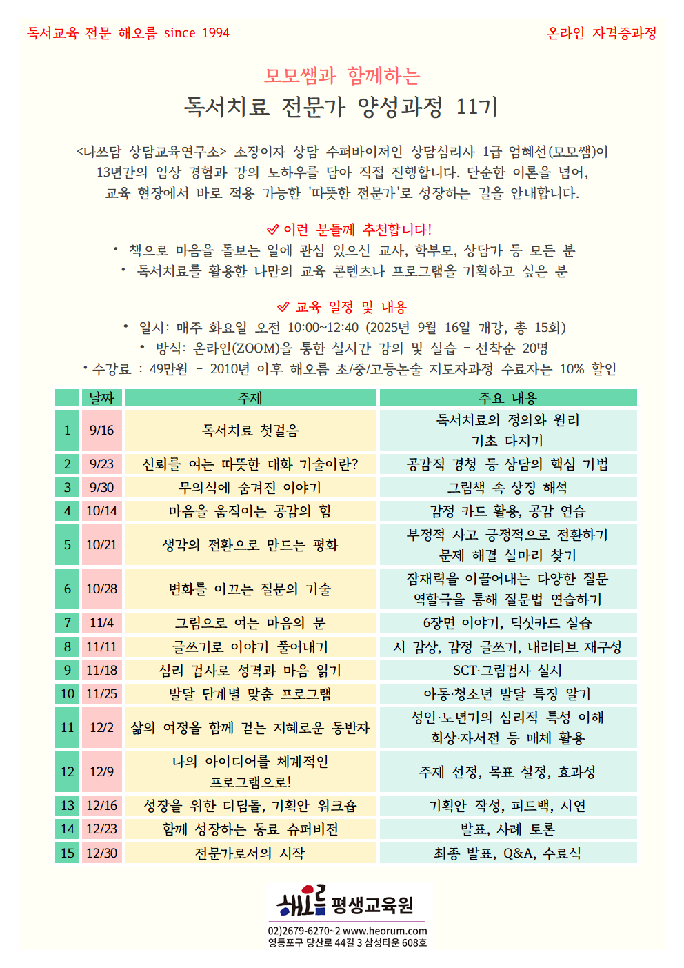 ❤️ 해오름 독서치료전문가 양성과정은 단순한 이론을 넘어, 교육 현장에서 바로 적용가능한 '따뜻한 교사', '따뜻한 부모'로 성장하는 길을 안내합니다^^