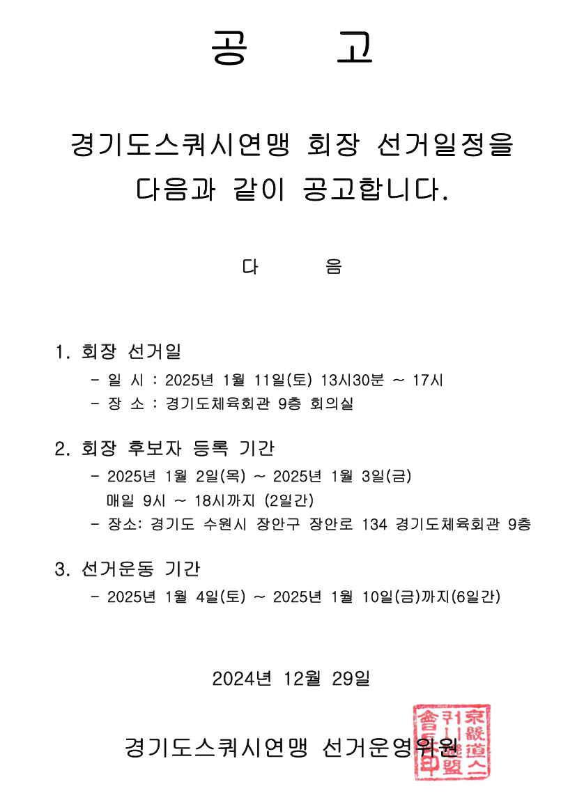 경기도스쿼시연맹 회장 선거일 공고 작성자경기도스쿼시연맹|작성시간24.12.29|조회수134 목록 댓글 0 글자크기 작게가 글자크기 크게가 1. 경기도스쿼시연맹 회장선거 공고일.pdf31.69KB2. 경기도스쿼시연맹 회장 선거 후보자 등록 안내문.hwp599.00KB3. 경기도스쿼시연맹 회장 선거 후보자 결격사유.hwp25.50KB 첨부파일첨부된 파일이 4개 있습니다. png 파일 image.png 다운로드 pdf 파일 1. 경기도스쿼시연맹 회장선거 공고일.pdf 다운로드 hwp 파일 3. 경기도스쿼시연맹 회장 선거 후보자 결격사유.hwp 다운로드 hwp 파일 2. 경기도스쿼시연맹 회장 선거 후보자 등록 안내문.hwp 다운로드 다음검색 현재 게시글 추가 기능 열기 북마크 공유하기 신고 센터로 신고 댓글 댓글 0 댓글쓰기 답글쓰기 댓글 리스트