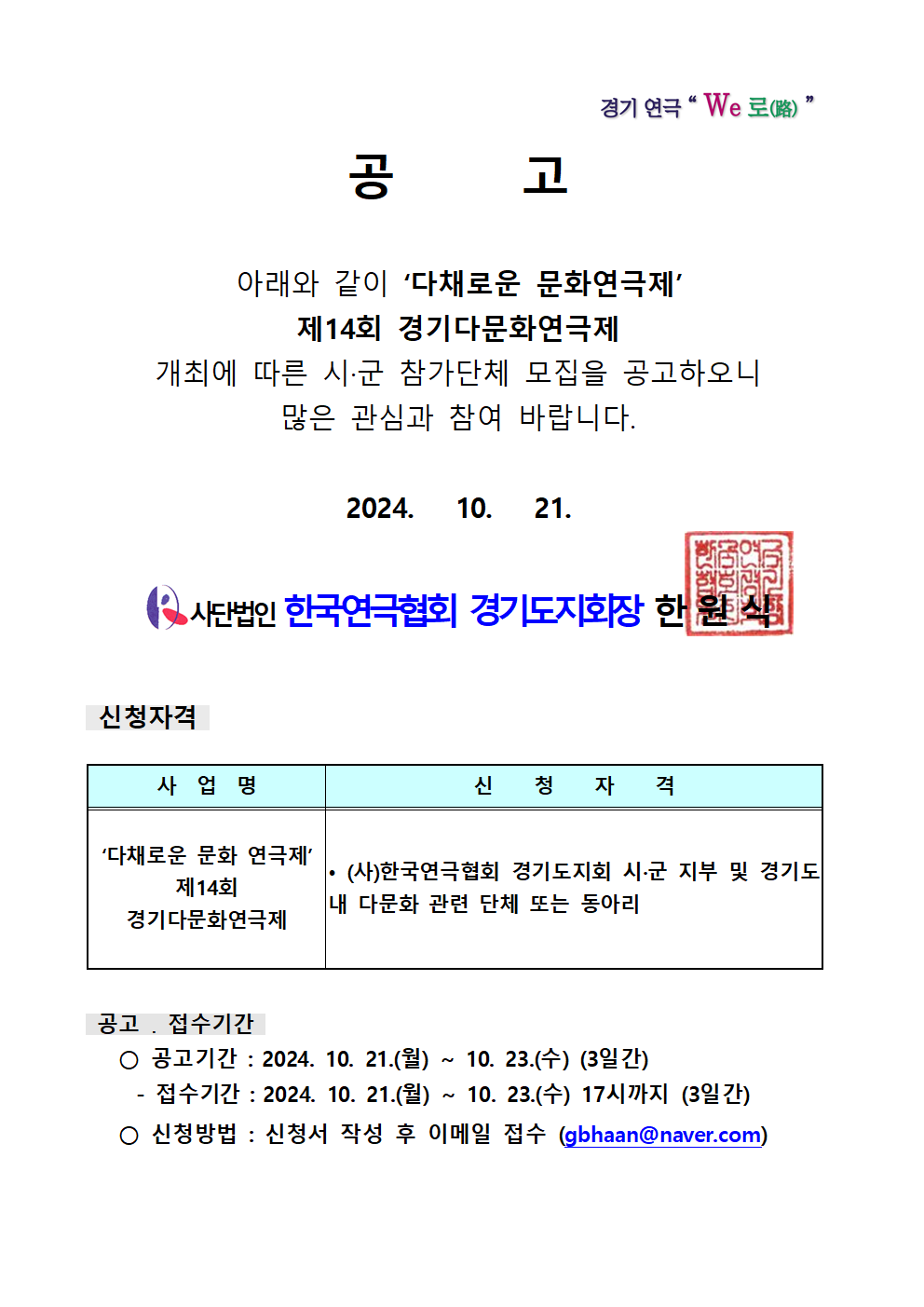 제14회 경기다문화연극제 참가단체 공고 작성자연극협회|작성시간24.10.21|조회수83 목록 댓글 0 글자크기 작게가 글자크기 크게가 2024-117 첨부2.제14회 경기 다문화연극제 사업계획 및 참가신청서식.hwp180.00KB 첨부파일첨부된 파일이 3개 있습니다. png 파일 제14회 경기다문화연극제 포스터.png 다운로드 png 파일 2024-117 첨부1.제14회 경기다문화연극제 참가단체 공고.png 다운로드 hwp 파일 2024-117 첨부2.제14회 경기 다문화연극제 사업계획 및 참가신청서식.hwp 다운로드 다음검색 현재 게시글 추가 기능 열기 북마크 공유하기 신고 센터로 신고 댓글 댓글 0 댓글쓰기 답글쓰기 댓글 리스트