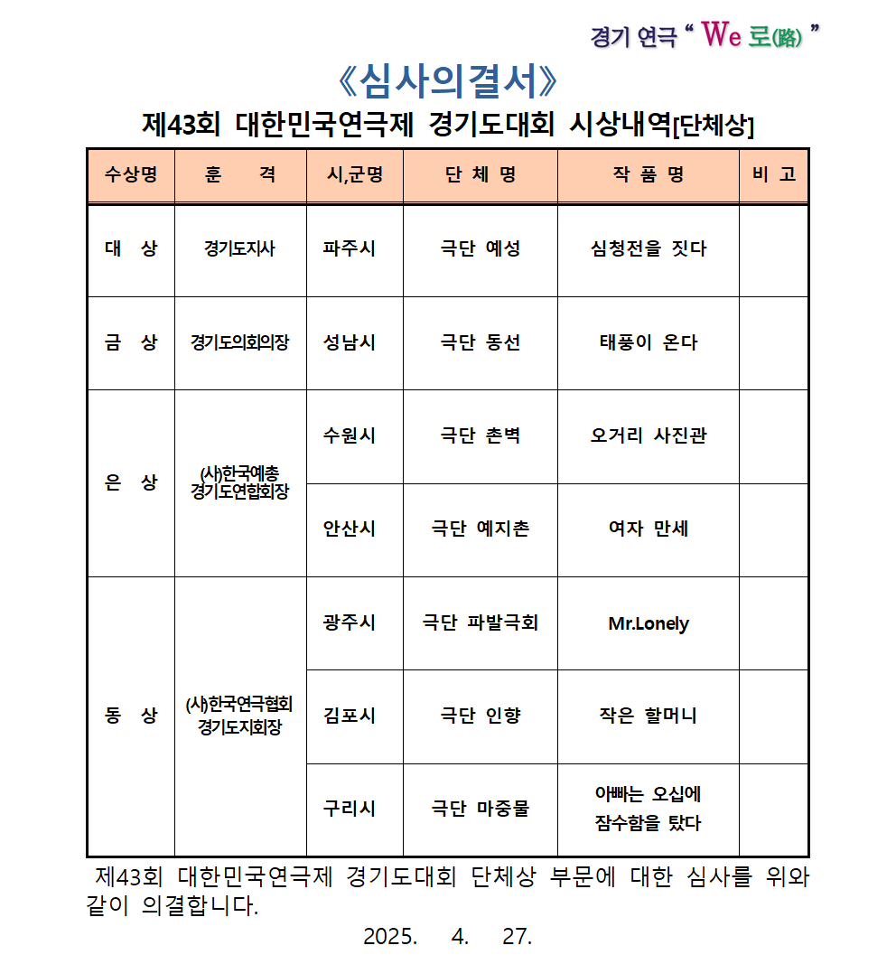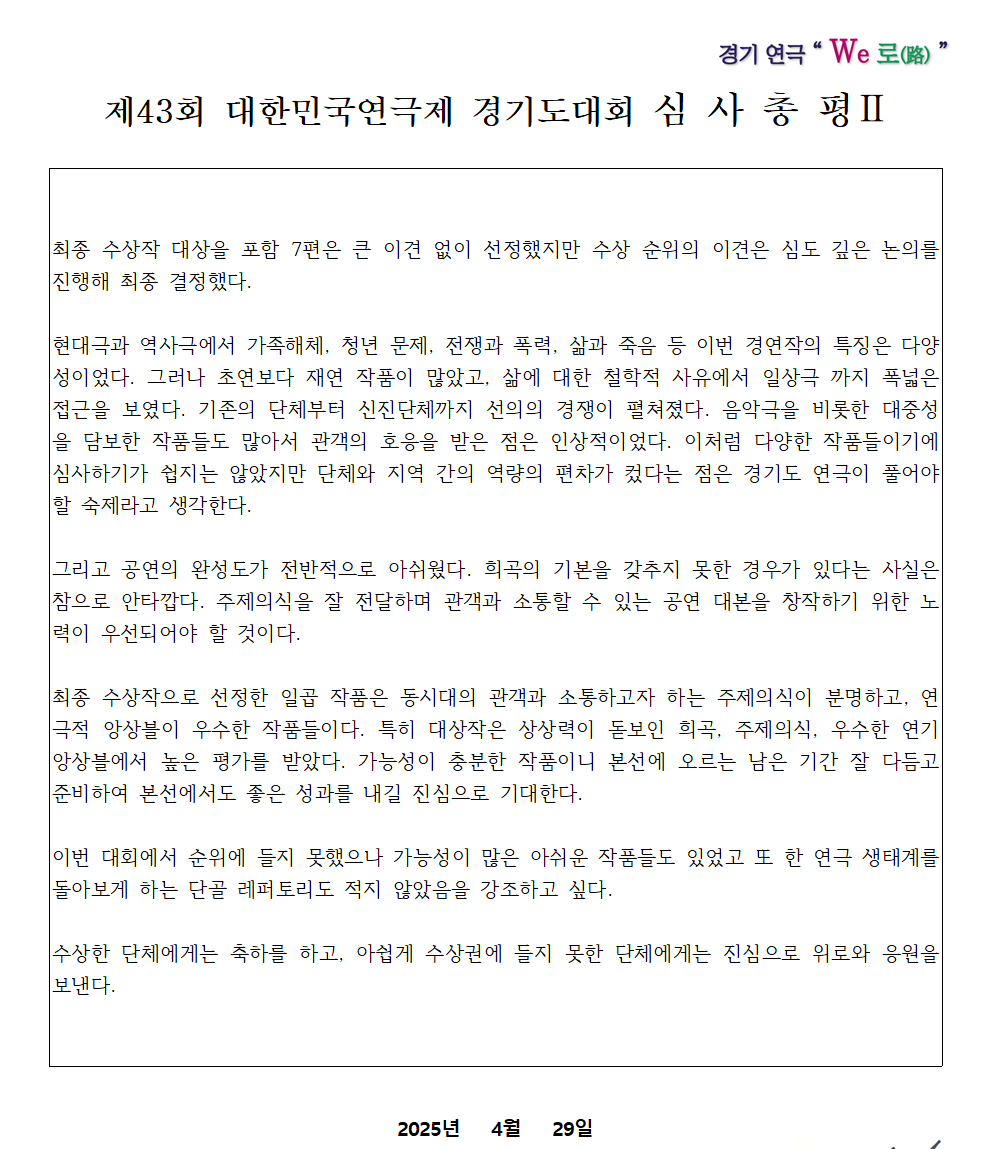 2025 제43회 대한민국연극제 경기도대회 심사총평 및 심사의결 작성자연극협회|작성시간25.05.04|조회수146 목록 댓글 0 글자크기 작게가 글자크기 크게가 다음검색 현재 게시글 추가 기능 열기 북마크 공유하기 신고 센터로 신고 댓글 댓글 0 댓글쓰기 답글쓰기 댓글 리스트