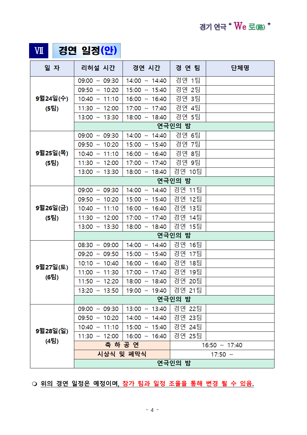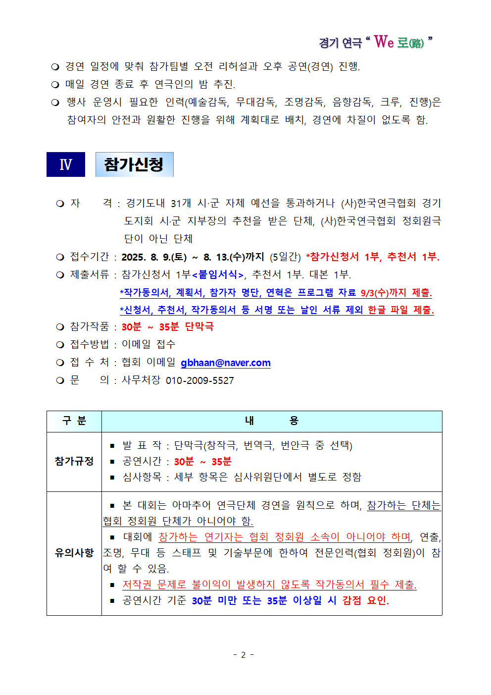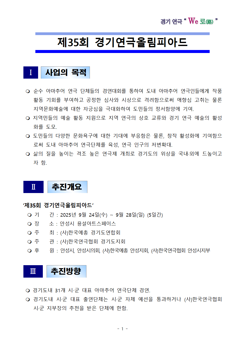 제35회 경기연극올림피아드 참가단체 모집공고 작성자연극협회|작성시간25.08.09|조회수82 목록 댓글 0 글자크기 작게가 글자크기 크게가 제35회 경기연극올림피아드 사업계획 및 참가신청서식.hwp241.50KB 첨부파일첨부된 파일이 7개 있습니다. png 파일 imagesdfsdfs001.png 다운로드 png 파일 imagesdfsdfs004.png 다운로드 png 파일 imagesdfsdfs002.png 다운로드 png 파일 imagesdfsdfs005.png 다운로드 png 파일 imagesdfsdfs003.png 다운로드 png 파일 공고_제35회 경기연극올림피아드001.png 다운로드 hwp 파일 제35회 경기연극올림피아드 사업계획 및 참가신청서식.hwp 다운로드 다음검색 현재 게시글 추가 기능 열기 북마크 공유하기 신고 센터로 신고 댓글 댓글 0 댓글쓰기 답글쓰기 댓글 리스트