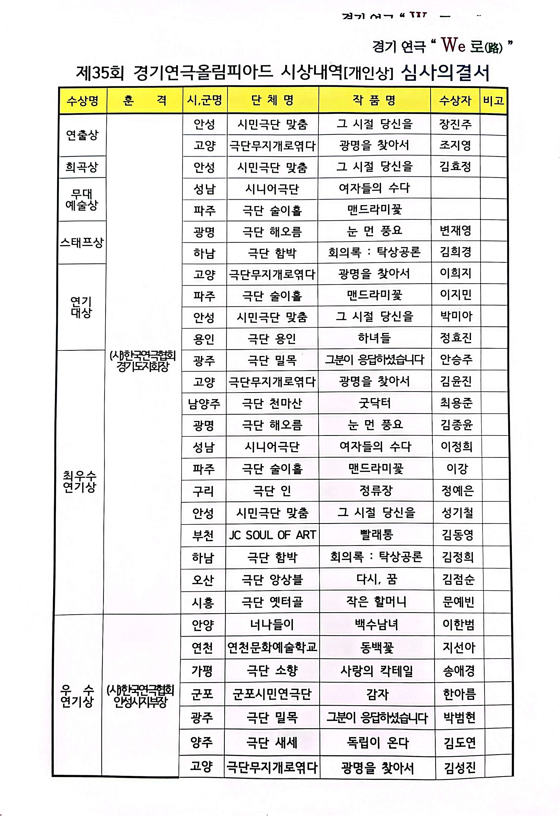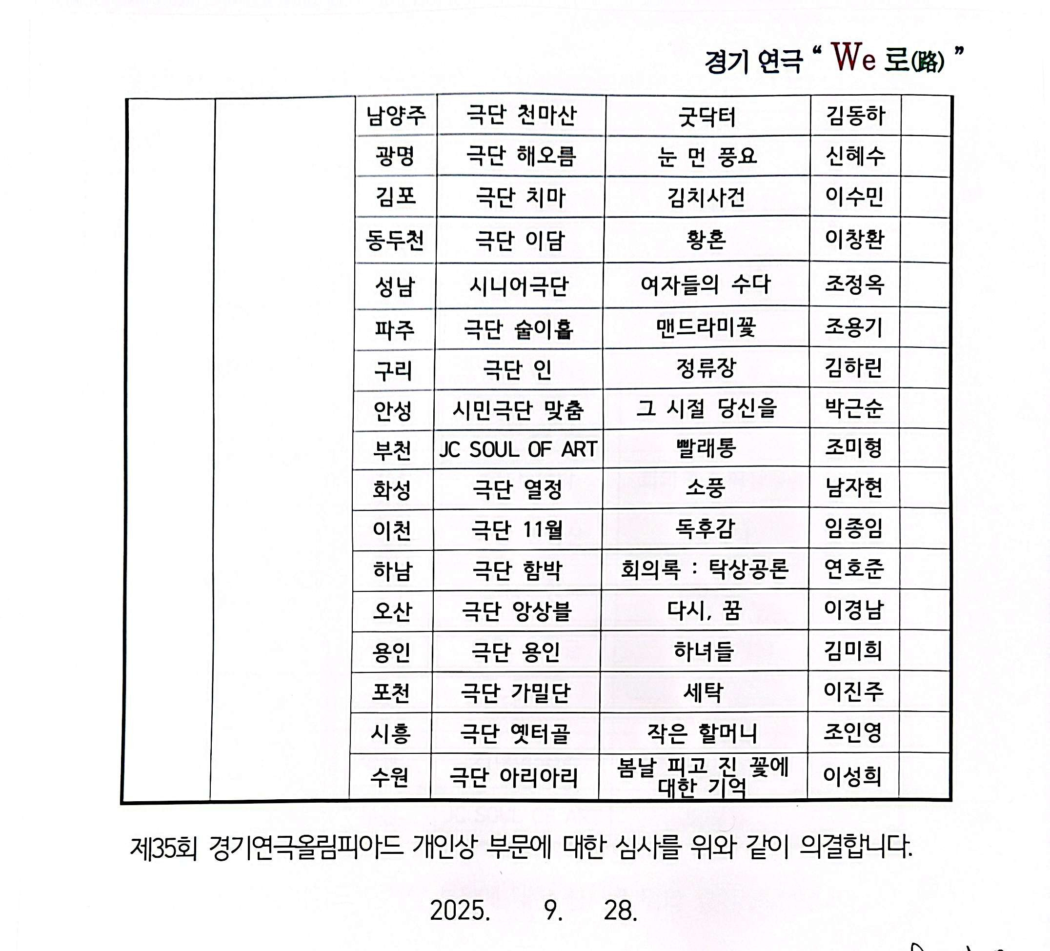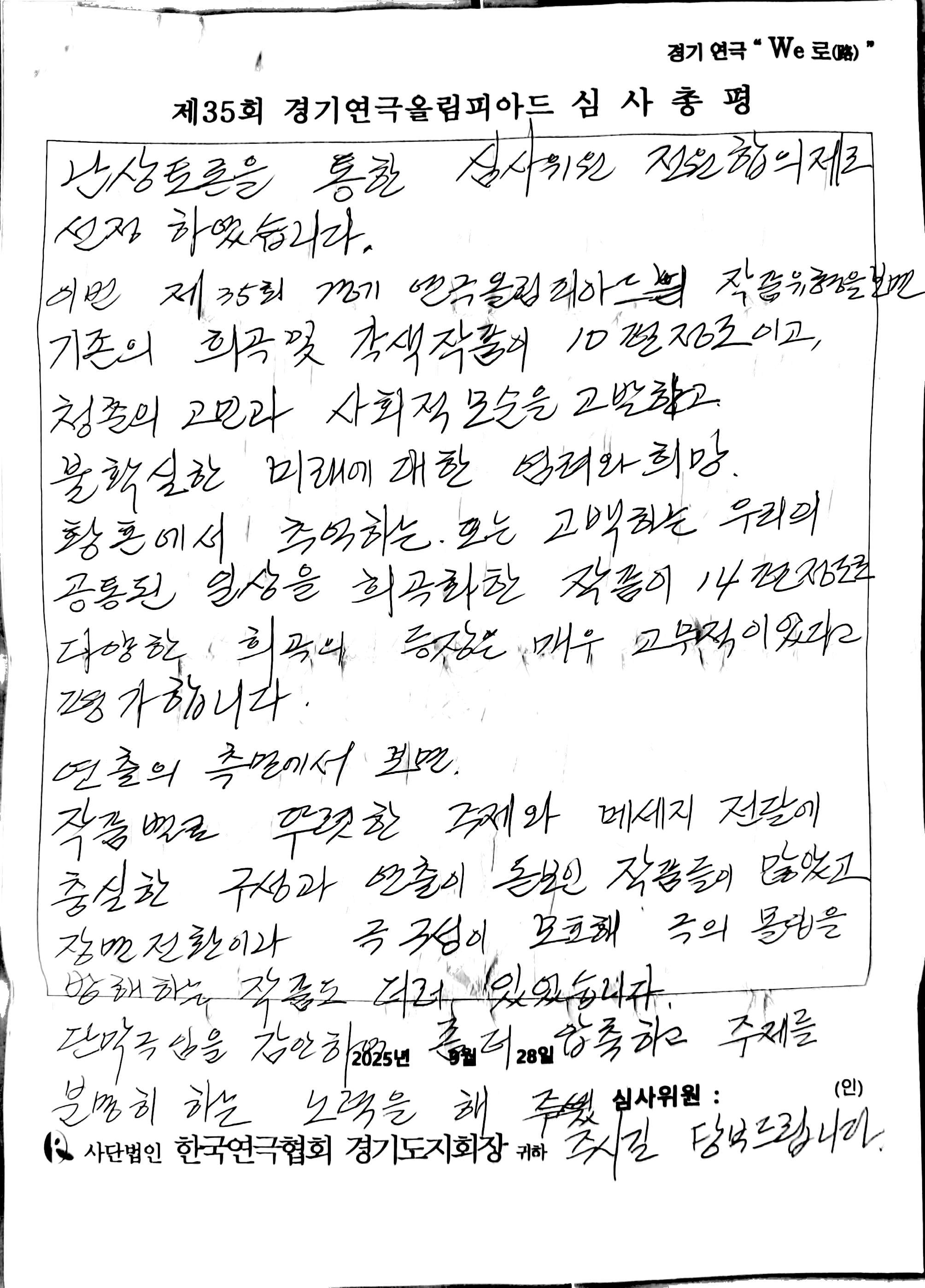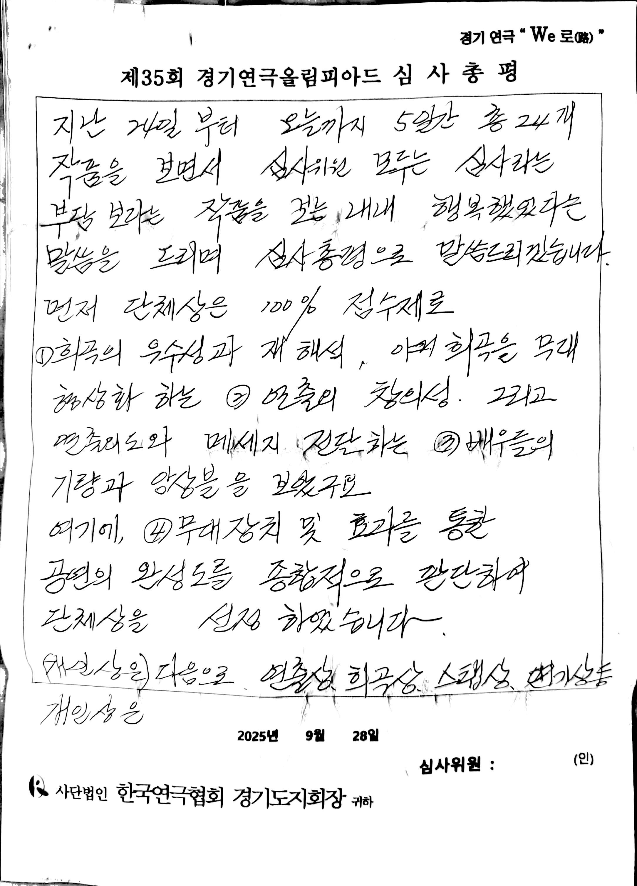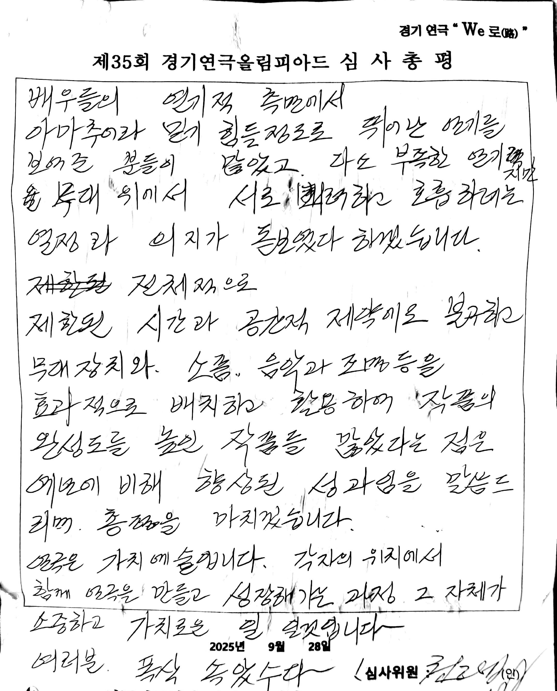 제35회 경기연극올림피아드 심사의결 및 심사총평 작성자연극협회|작성시간25.09.29|조회수65 목록 댓글 0 글자크기 작게가 글자크기 크게가 다음검색 현재 게시글 추가 기능 열기 북마크 공유하기 신고 센터로 신고 댓글 댓글 0 댓글쓰기 답글쓰기 댓글 리스트