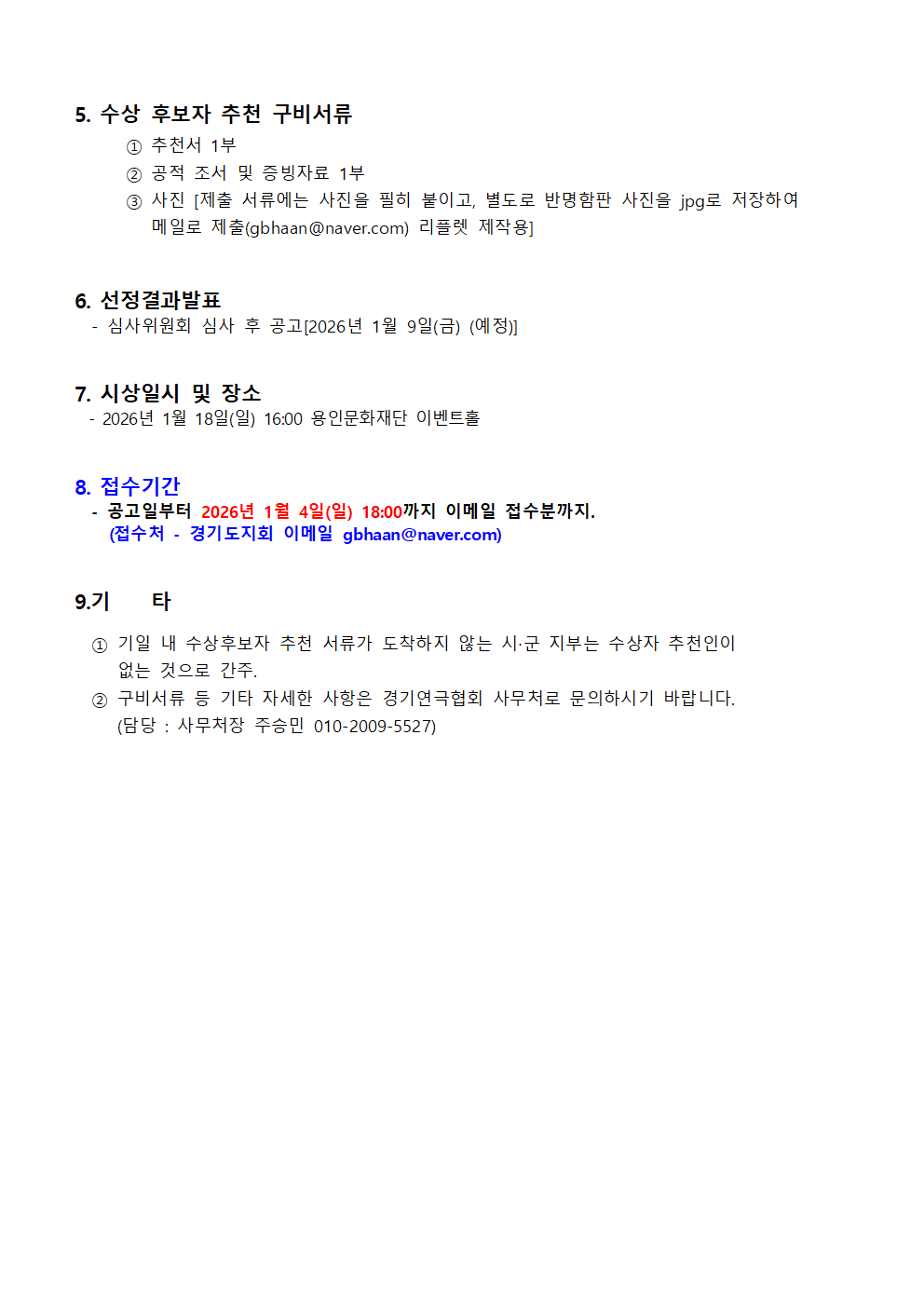 제29회 경기연극상 공고 작성자연극협회|작성시간25.12.24|조회수18 목록 댓글 0 글자크기 작게가 글자크기 크게가 제29회 경기연극상 후보자추천 공고 및 신청서.hwp58.00KB 첨부파일첨부된 파일이 3개 있습니다. png 파일 제29회 경기연극상 공고2001.png 다운로드 png 파일 제29회 경기연극상 공고1001.png 다운로드 hwp 파일 제29회 경기연극상 후보자추천 공고 및 신청서.hwp 다운로드 다음검색 현재 게시글 추가 기능 열기 북마크 공유하기 신고 센터로 신고 댓글 댓글 0 댓글쓰기 답글쓰기 댓글 리스트