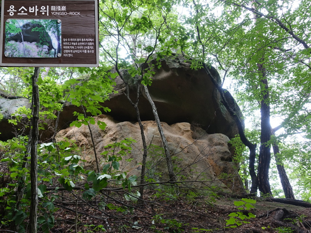 승천하면서 남긴 용비늘 자국이 있다.깎아지른 암봉과 기암괴석이 울창한 수풀로 둘러싸인 산세가 아름다운 대야산 제일의