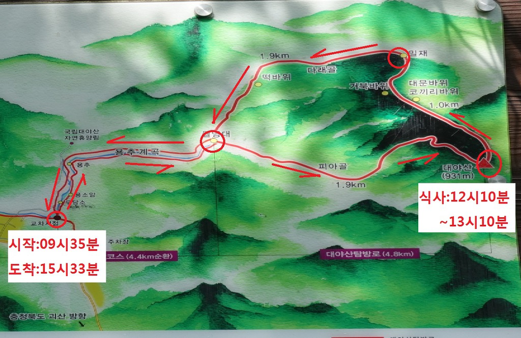월영대에서 피아골을 거쳐 대야산정상에서 점심 먹고 밀재로 해서 하산하니 15시 30분이 조금 넘었더군요.ㅎ