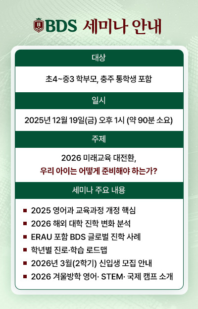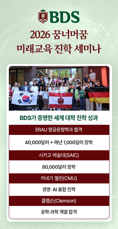 2026 BDS 꿈너머꿈 미래교육 진학 세미나 BDS G12 이연준 — 엠브리 리들 항공운항학과 장학생 선발 아침편지 가족 여러분, 안녕하세요. 깊은산속 옹달샘에서 대한민국 꿈쟁이들과 함께하고 있는 BDS의 줄리 선생님입니다. 오늘은 정말 기쁜 소식을 먼저 전합니다. BDS 국제학교 12학년 이연준 학생이 미국 항공 명문대 엠브리 리들 항공운항(ERAU) 학과에 최종 합격했습니다. 그리고 더욱 놀라운 소식, 총 40,000달러 장학금 수혜 확정! 여기에 매년 1,000달러씩 추가 지원 장학금까지! '하늘의 하버드'로 불리는 ERAU는 북미 항공사 조종사 4명 중 1명을 배출하고, 대한항공을 포함한 글로벌 항공사와 패스웨이(연계 취업 루트)를 갖춘 세계 최고 수준의 항공 전문대학입니다. 연준이의 이번 합격은 단순한 성적의 결과가 아니라 5년 동안 깊은산속 옹달샘에서 받아온 전인교육 + 국제 교류 + 공동체 성장 환경 속에서 차곡차곡 키운 마음의 힘이 만들어낸 값진 성취입니다. 그리고 이 길은, 여러분의 자녀에게도 똑같이 열려 있습니다. "우리 아이 교육, 이제는 새 기준이 필요합니다. 2026년부터 달라지는 TOEFL· SAT, 2027년 전 학년 적용되는 새 영어과 교육과정, 그리고 변화 속도가 점점 빨라지는 글로벌 진학 환경. 이번 세미나는 부모님들께 꼭 필요한 미래 교육 변화 + 진학 전략 + 2026년 신입생 안내를 하루에 모두 정리해 드리는 자리입니다. 이 모든 결과는 '문제풀이'가 아닌 전인교육이 만든 마음의 힘에서 시작되었습니다. 왜 지금 BDS 여야 하는가? 1) 미래 교육 변화에 가장 빠르게 대응하는 학교 2027 영어과 개정 핵심 → 학년별 대비 전략 제공 2) 깊은산속 옹달샘 기반 전인교육 시스템 국제 교류 · 공동체 문화 · 자기 주도 프로젝트 3) 실제 결과로 증명된 글로벌 진학력 ERAU· CMU· 클렘슨· SAIC 등 '말이 아닌 진짜 성과' 여러분의 자녀도 다음 합격 스토리의 주인공이 될 수 있습니다. 미래는 준비된 아이에게 열립니다. 그 준비가 시작되는 곳 BDS입니다. 사랑합니다. 감사합니다. 아침편지 명상치유센터 깊은산속 옹달샘에서... 2025년 12월 19일 학부모 교육세미나 신청하기 그 기도를 또 정성 들여 해봅니다 무지개 같은 것은 품지 못하고 살아도 좋으니, 단조롭고 고독해도 좋으니, 누군가를 먼저 보내는 일만은, 누군가의 뒤에 남겨지는 일만은 다시없게 해달라는, 말이 되지 않는 기도를 또 정성 들여 해 본다. 부처님께. 하느님께. - 황주하의《그 길 위의 모든 것들 고마워》중에서 - * 소중했던 인연, 사랑하는 사람을 먼저 보내야 하는 아픔을 어떻게 하면 겪지 않을 수 있을까요? 그것이 가능하지 않음을 알면서도 우리는 기도합니다. 그 간절한 기도를 또 정성 들여 해봅니다. 오늘도 많이 웃으세요 |