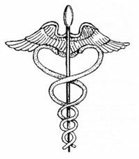 두 마리 뱀이 감싸고 있는 아스클레피오스의 지팡이(의술의 상징)