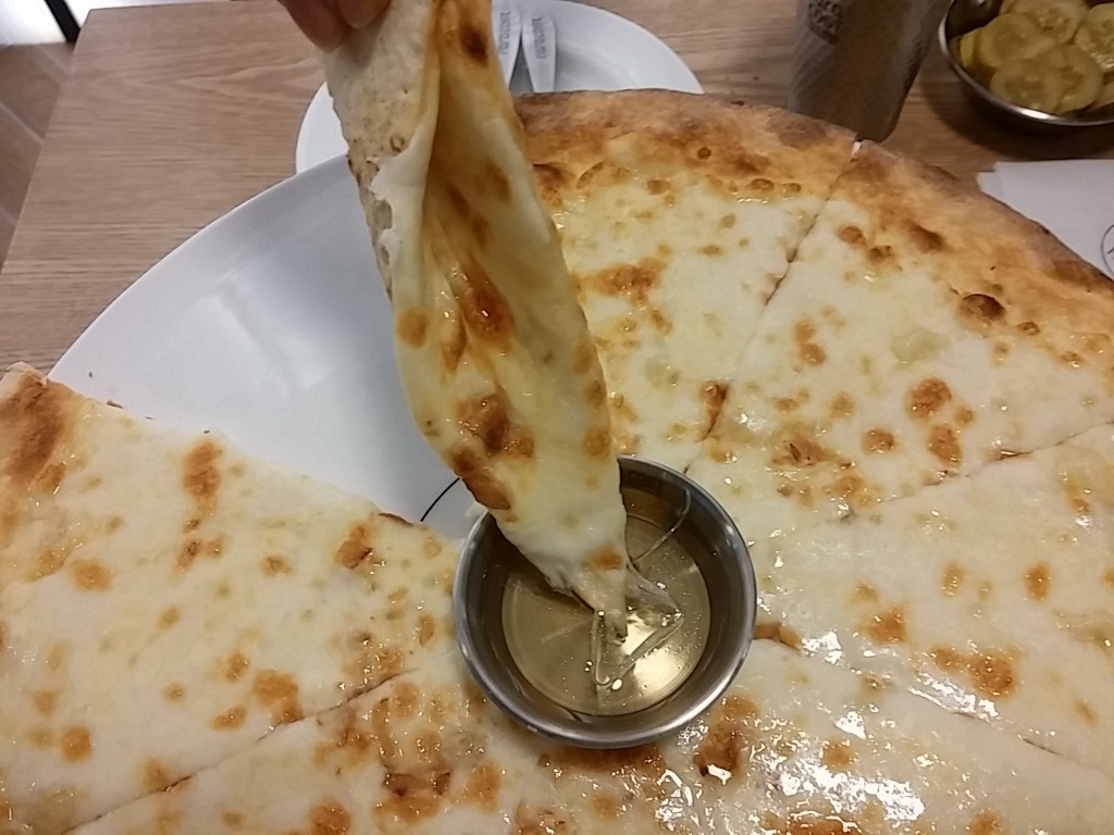 가운데에 있는 것은 꿀이에요. 피자를 찍어서 먹으면 정말 맛있어요.