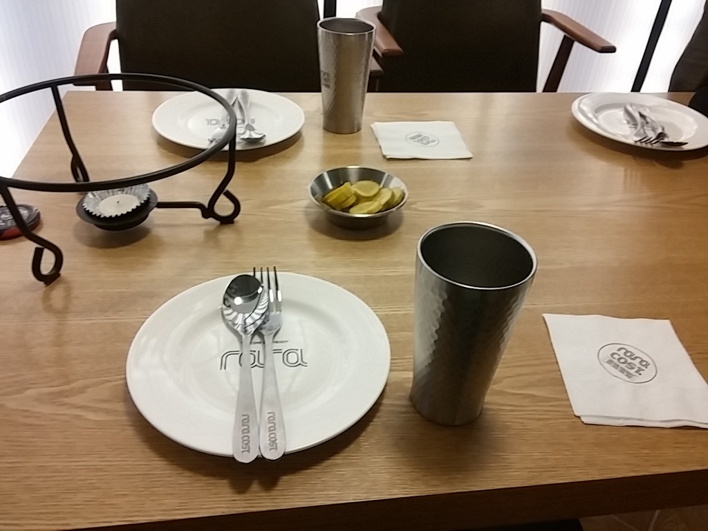깔끔하게 접시에 숟가라 및 포크, 스테인리스로 된 물컵, 피클 등 세팅이 되어 있어요.