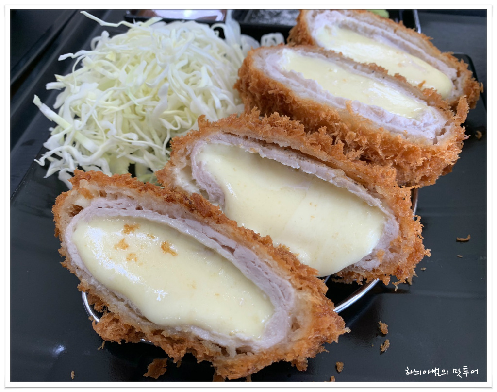 치즈의 풍미가 느껴지고 얇은 돼지고기의 맛이 치즈와 함께