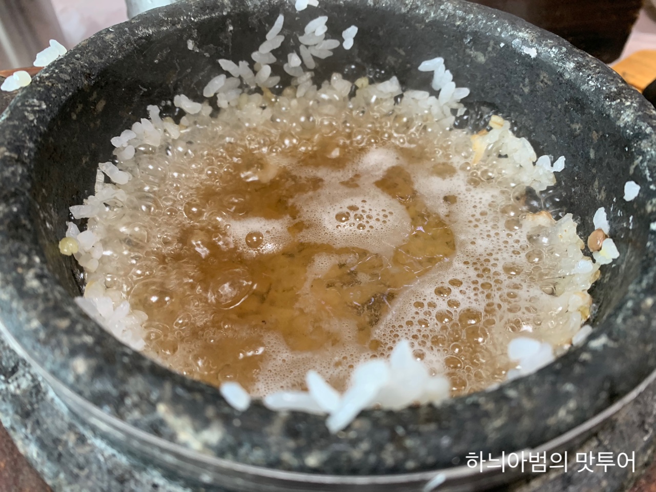 돌솥밥에 밥을 비빌대접에 담고 돌솥에 누른밥은