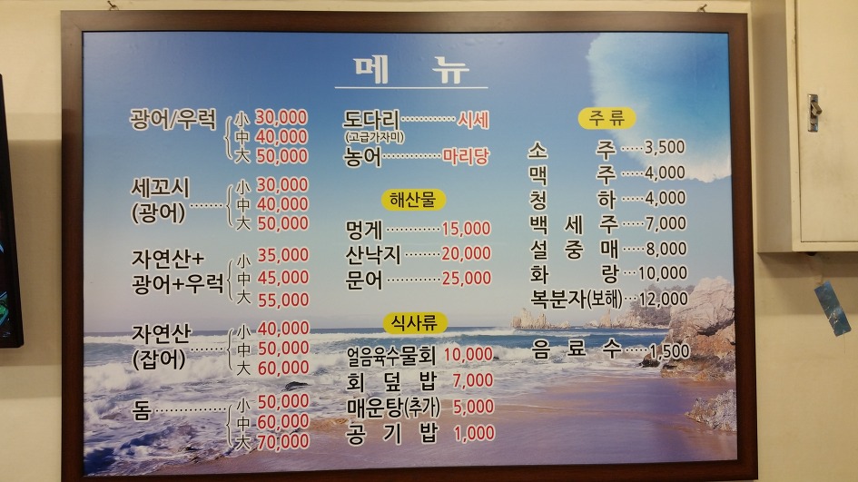 자연산 + 광어 + 우럭 메뉴 입니다 .