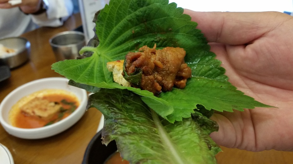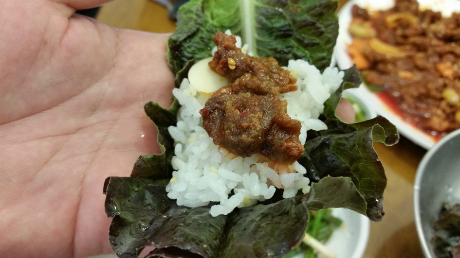 쌈에 밥과 불고기를 올려 먹어보고 ...