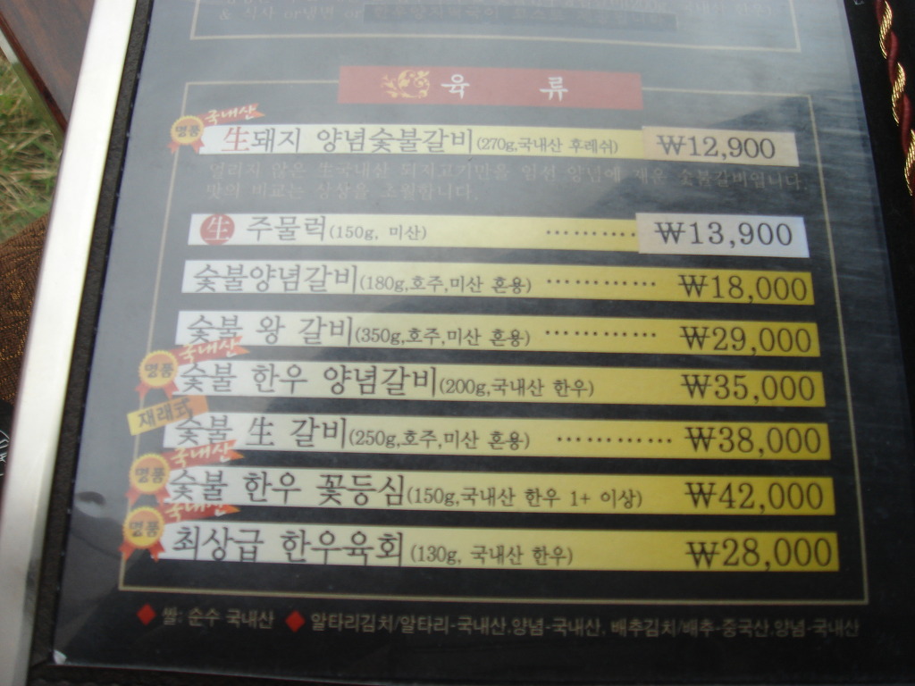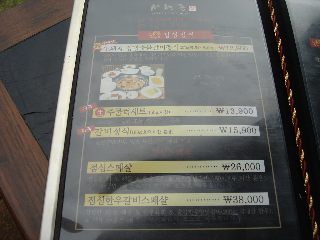 메뉴판입니다..저희가 시킨메뉴는 생돼지양념숯불갈비정식..