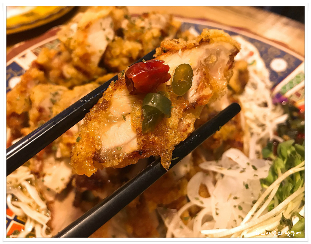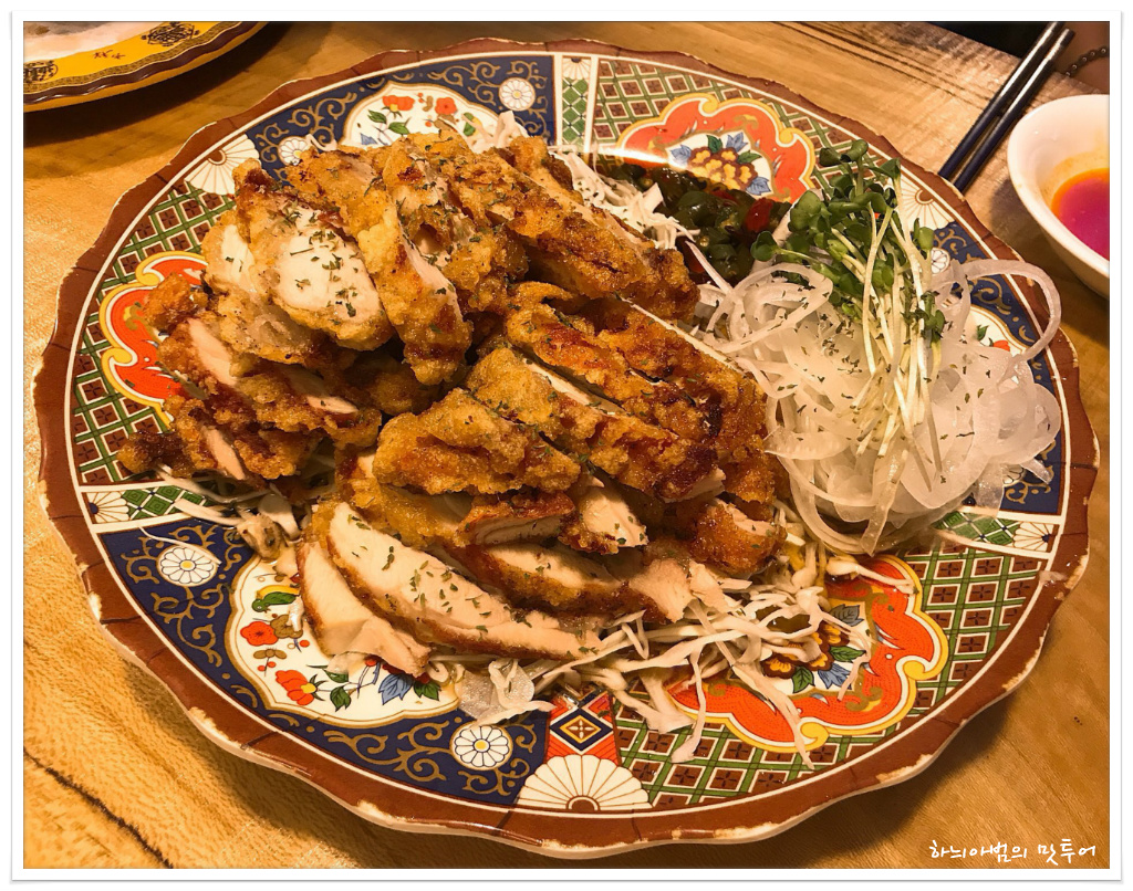시원한 간장 소스에 채소와 곁들여 먹는 닭튀김 요리입니다