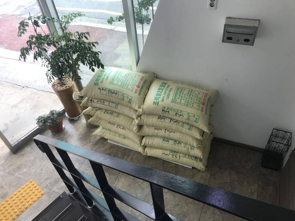 2층으로 올라가는 계단앞에 쌀포대가 반겨주네요.