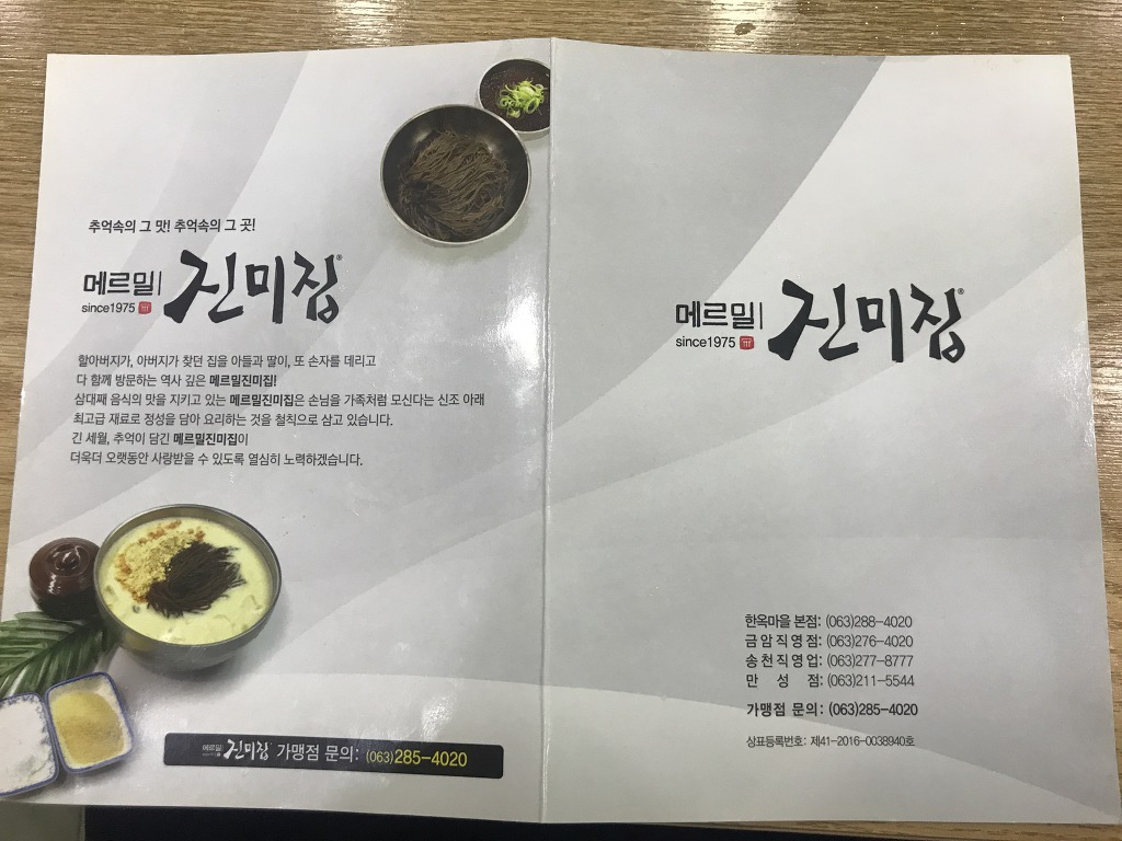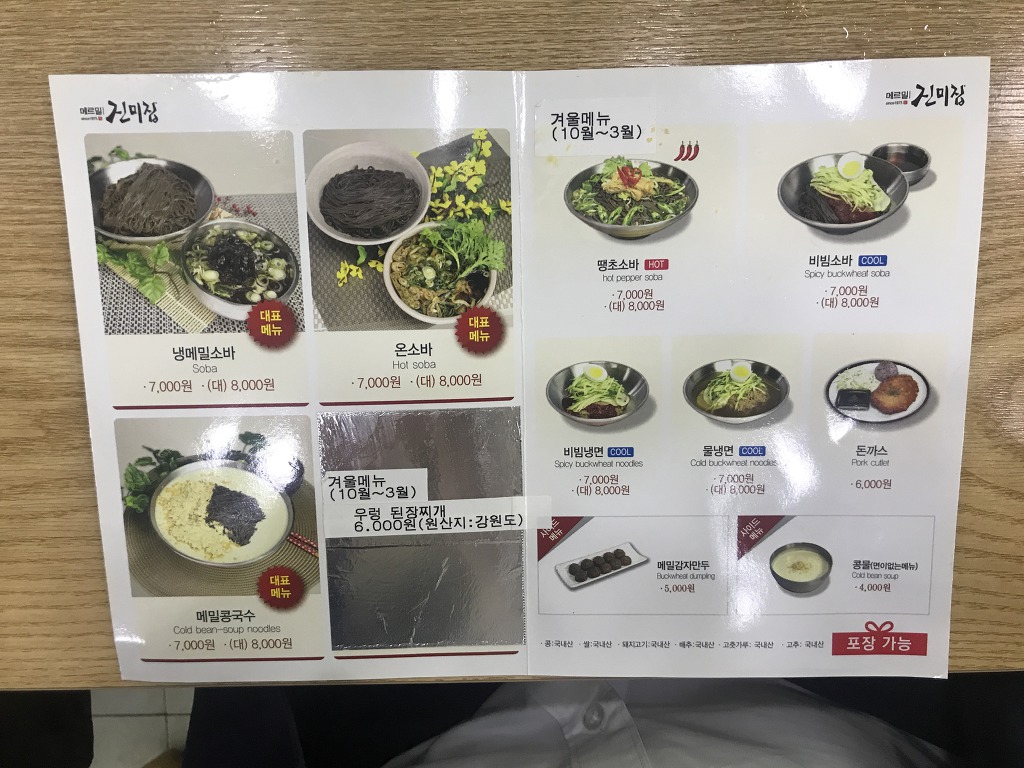 | 메뉴/가격 | 냉메밀소바 7,000원, 메밀콩국수 7,000원, 메밀감자만두 5,000원 |