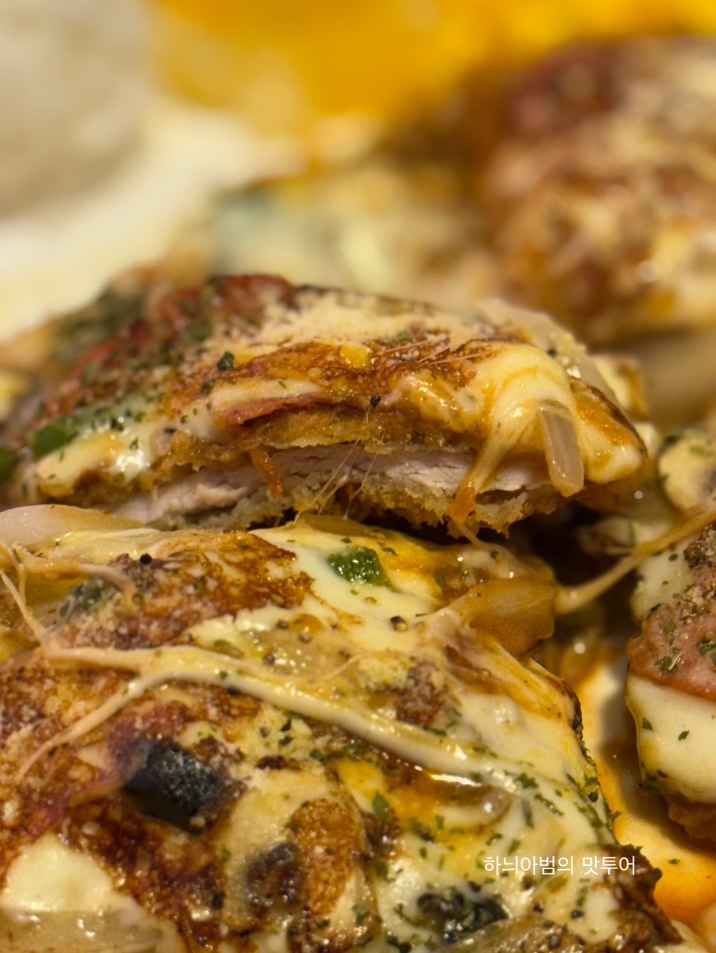 돈까스는 도우 역할 그위에 치즈와 토핑이~