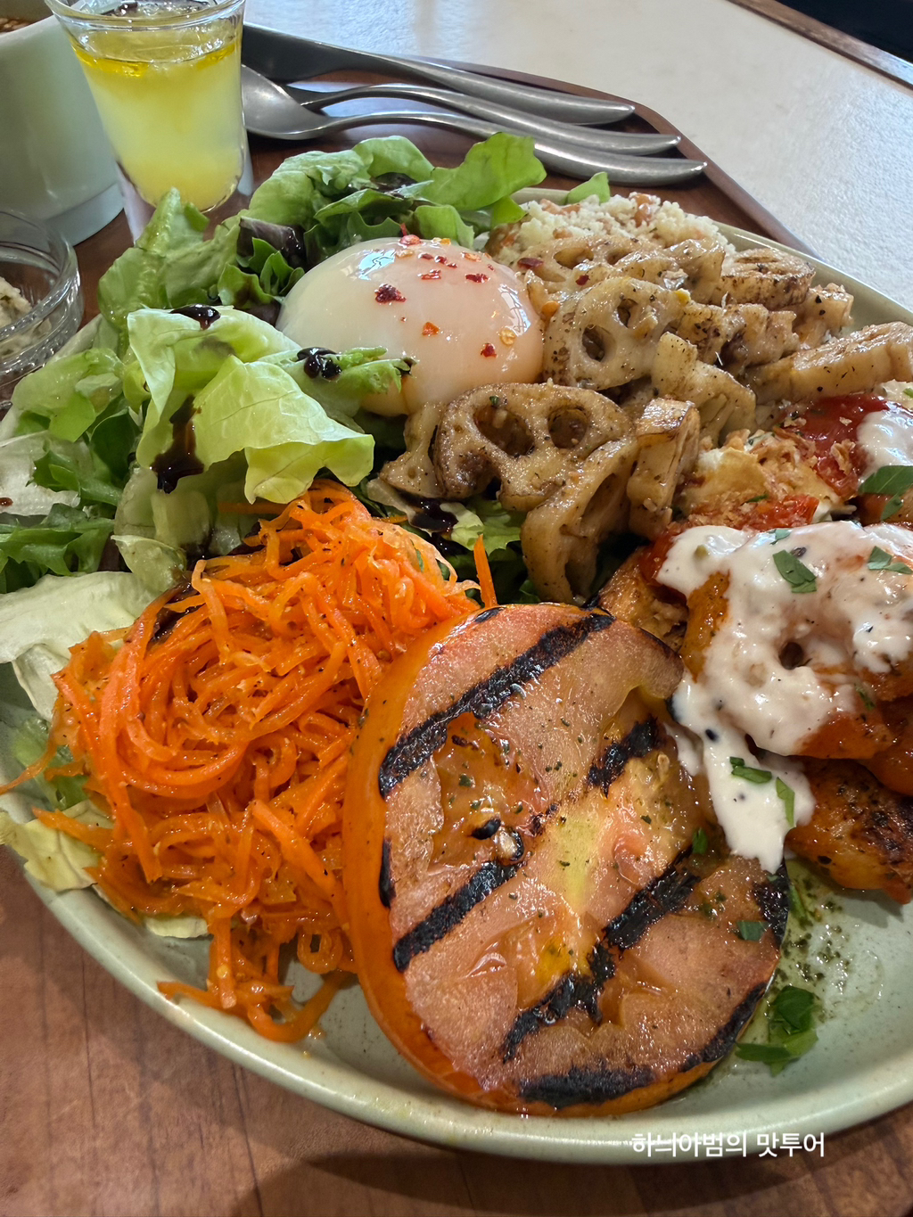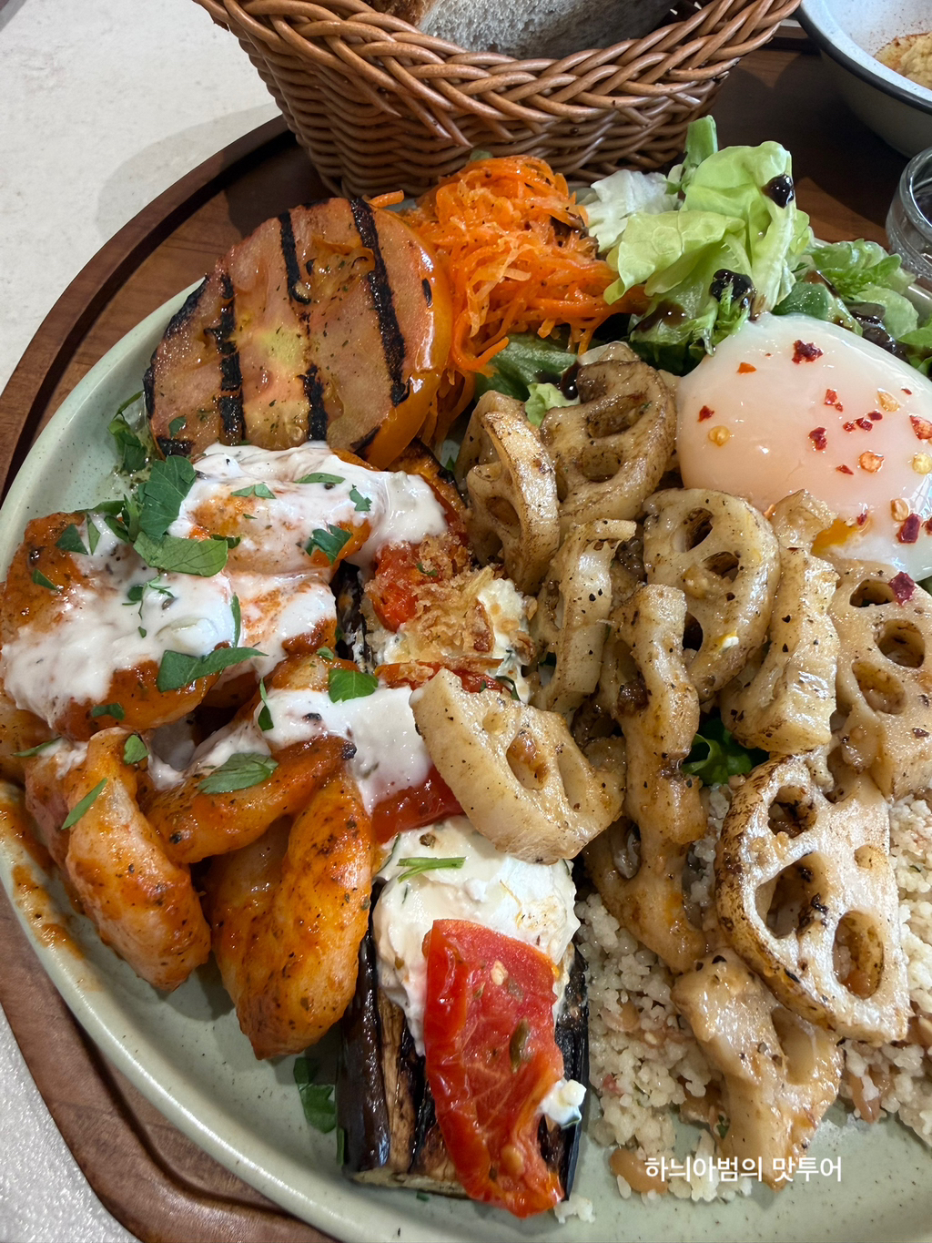 샐러드, 당근라페, 구운 토마토, 구운 야채등, 빵, 소스,
