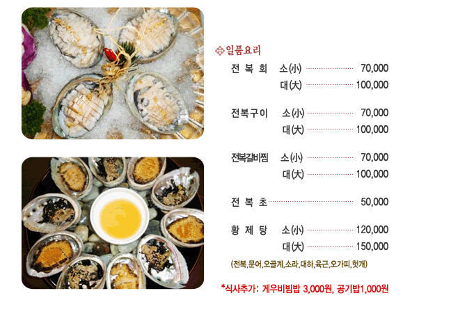 | 메뉴/가격 | 황제탕 - 150,000원, 비빔밥 - 3,000원 |
