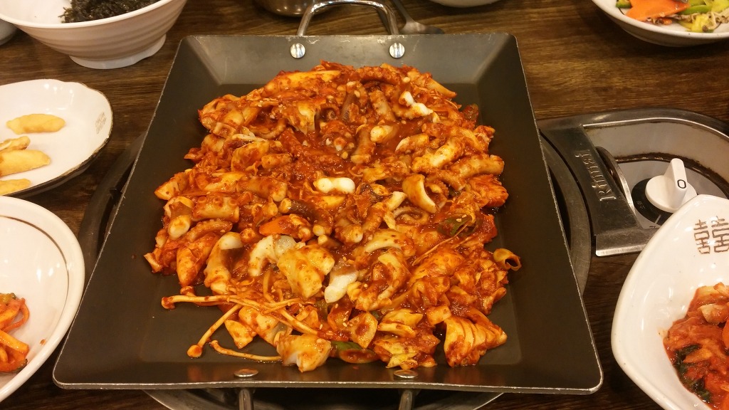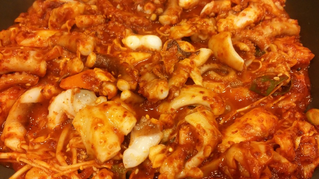 주메뉴인 낚지볶음(2인)인대요 금방 나오더라구요. 근데 나오자 마자 저휠 충격에 빠뜨린건 소..소면이 없었다는 점입니다. 인터넷에서 검색했을때 다른분들 음식엔 나오는거 같던대 ㅜㅠ 그래서 따로 가져다주는 거냐고 희망을 갖고 서빙아주머니에게 물어봤지만.. 원래 없다네요 소면 자체가 없답니다. 우동 사리만 따로 시킬수 있다 하구요 ㅎㅎ. 제가 사진을 잘못 봤었나봐요.