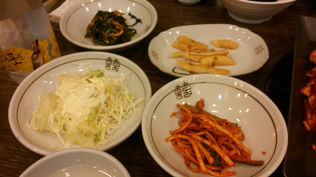 사진 오른쪽에 보이는 감자튀김은 사실 좀 뜨악했는데. 설마 감자튀김인가 했는데 맞더라구요. 급식 반찬 같은데서 예전에 보던 그 맛. 그렇다고 막 튀겨서 바삭한것도 아닌 눅눅한 맛까지 그대로 재현. 이런건 반찬에서 빠져도 될거 같아요. 다행히도 제가 좋아하는 된장에 버무린 무침도 있었어요.