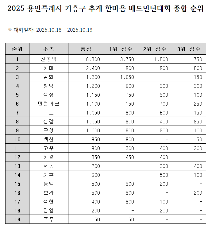 2025 용인특례시 기흥구 추계 한마음 배드민턴대회 종합 순위 작성자김준한/연합회 운영이사|작성시간25.10.21|조회수52 목록 댓글 0 글자크기 작게가 글자크기 크게가 다음검색 현재 게시글 추가 기능 열기 북마크 공유하기 신고 센터로 신고 댓글 댓글 0 댓글쓰기 답글쓰기 댓글 리스트