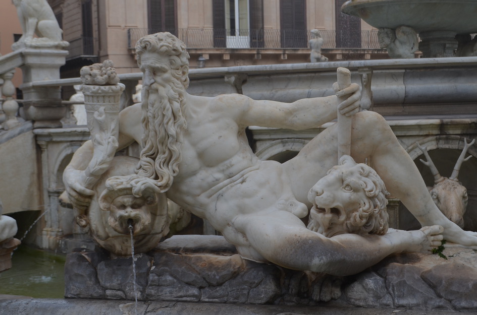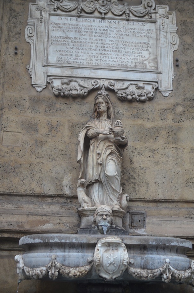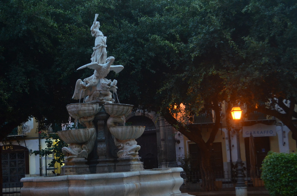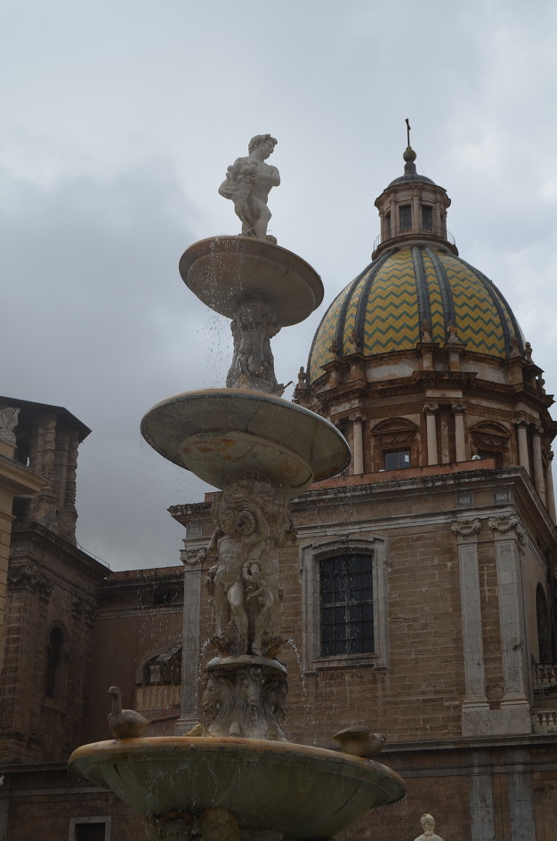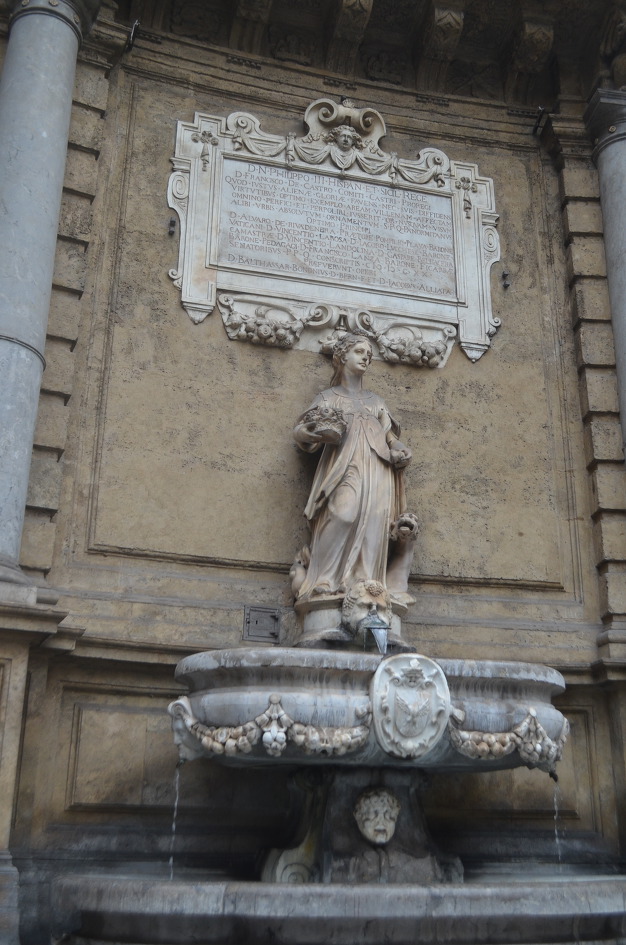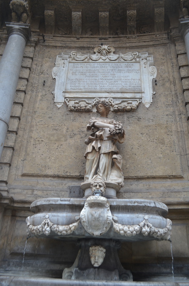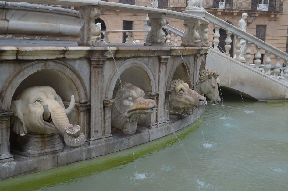 (프레토리아 분수)로 불려지는 이 분수대는 본래 이탈리아 중부 피렌체의 (산 클레멘토 궁전)에 있던 분수였다. 1554년 피렌체의 조각가 '프란체스코 카밀라니'가 만든 당시 피렌체에서도 화려하고 왕성도 높기로 아주 유명한 분수였다. 산 클레멘토 가문에 환란이 덥쳐 일가족이 맨몸으로 나폴리로 겨우 피신을 하였는데, 당시 나폴리를 여행하던 먼 친척 일가였던 '돈 루이자' 가문의 수장이 '산 클레멘토' 가문이 무사히 피난 생활을 영위하게끔 물심양면으로 도움을 주었다. 훗날 피렌체로 복귀한 '산 클레멘토'가 이때은 구은을 보답하고자 하였는데 거듭 사양을 하자, 이 분수대를 644개의 조각으로 분해하여 마차에 싣고 배로 실어날라 마침내 팔레르모의 프레토리아 궁전 앞마당에 선물하였던 것이다. 아름다운 여신상에서 부터 삶에 지친 할아버지 상까지 48개의 다양한 조각상이 옮겨지는 장장 10년에 걸친 대공사였다. 시대의 흐름에 '돈 루이지 가문'이 몰락하자 팔레르모 시가 광장을 포함한 궁전을 사들여서 오늘날에 이르고 있다. 이 프레토리아 분수는 이탈리아 우표에도 등장 할 만큼 로마의 (트레비 분수)와 함께 이탈리아를 대표하며 르네상스를 대표하는 걸작으로 평가받고 있다.