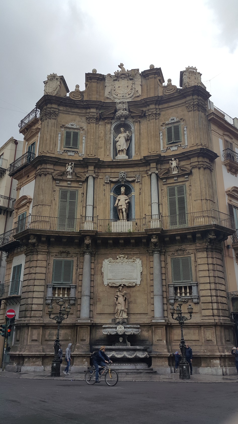 건축가이자 조각가인 (줄리 오라소)가 이 네거리의 모퉁이마다 똑 같은 크기에 똑 같은 모양을 한 4개의 건축물을 만들고 분수대를 설치했다. 1608년에 시작해 12년의 공사기간을 거쳐서 완공했다. 각기 4개의 건물 1층에는 이곳 시칠리아에서 기독교의 신앙을 지키려다 순교한 4명의 성녀 '산타 크리스티나' '산타 닌파' '산타 올리바' '산타 아가타'의 조각상이 모셔져 있다. 2층에는 시칠리아를 빛낸 왕들, '카를로스 5세' ' 필리 2세' '필리 3세' ' 필리 4세'의 모습이 서로 위용을 뽐내듯이 장식되어있고, 3층에는 봄 여름 가을 겨울을 장식하는 4명의 여신들이 자리하고 있다.
