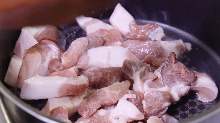 두툼한 냄비에 돼지고기를 넣어 주세요.